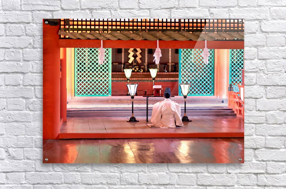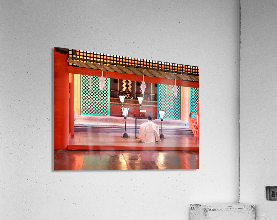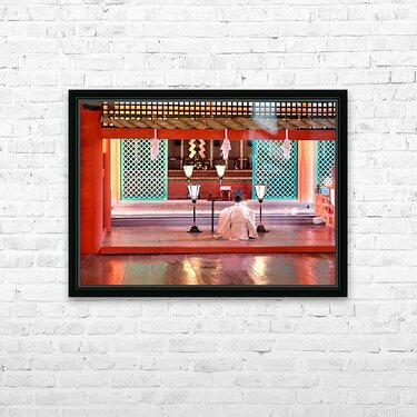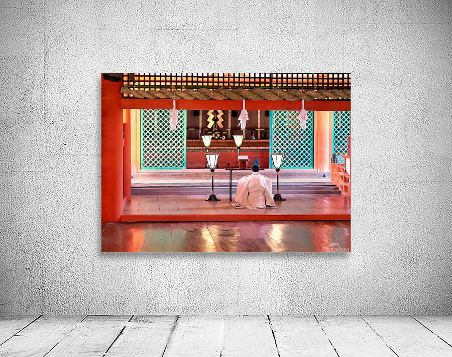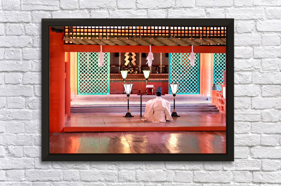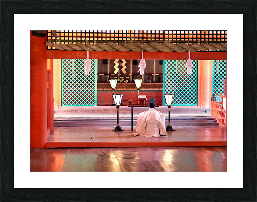 "Monk prays in meditation at Itsukushima shrine in Japan" in a framed print.