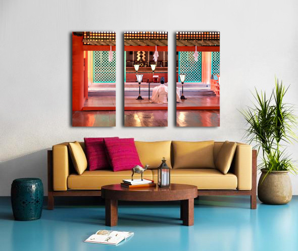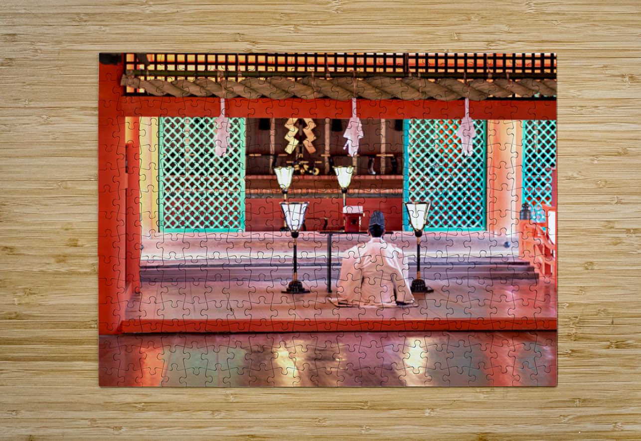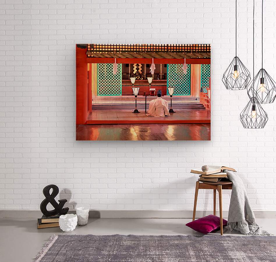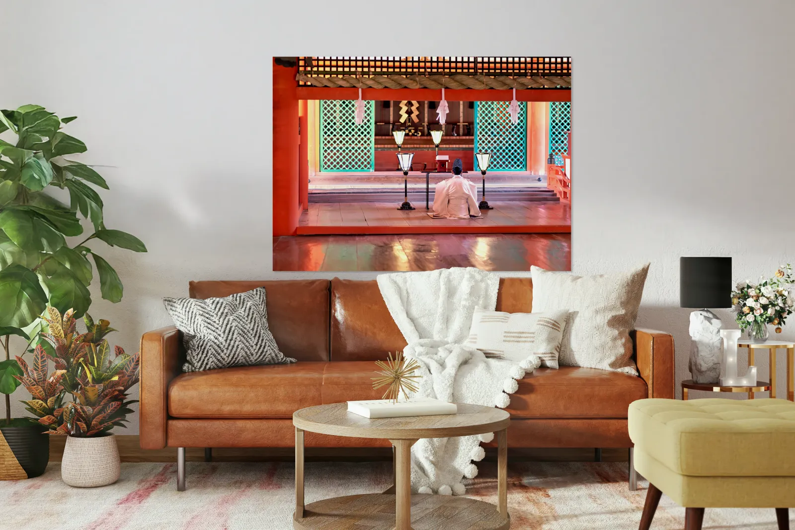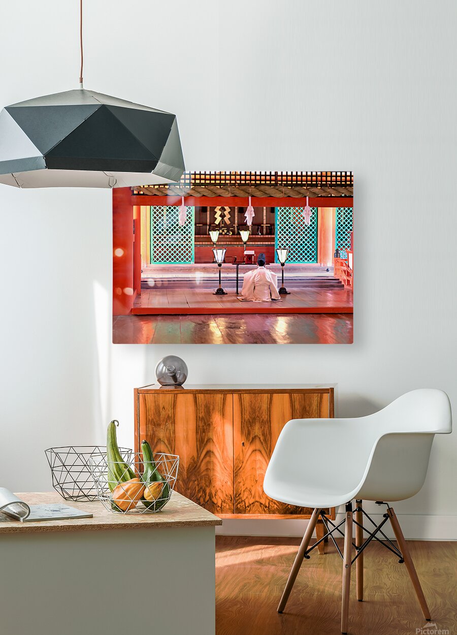 "Monk prays in meditation at Itsukushima shrine in Japan" in a framed print.