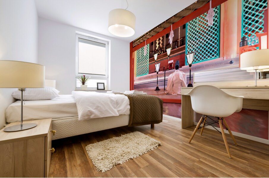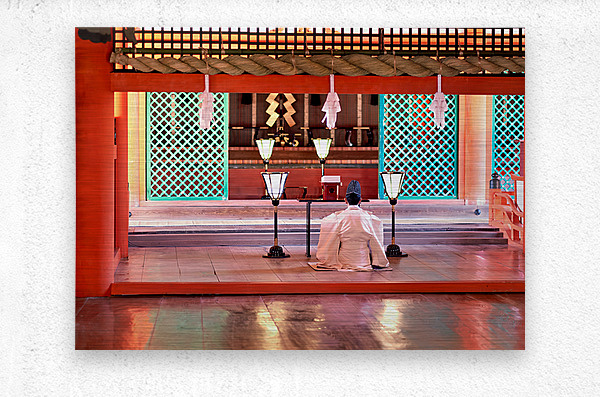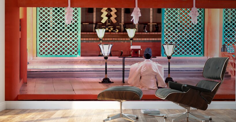 A monk sits in meditation at Itsukushima shrine in Miyajima Hiroshima. The vibrant setting enhances the solemn moment of prayer.