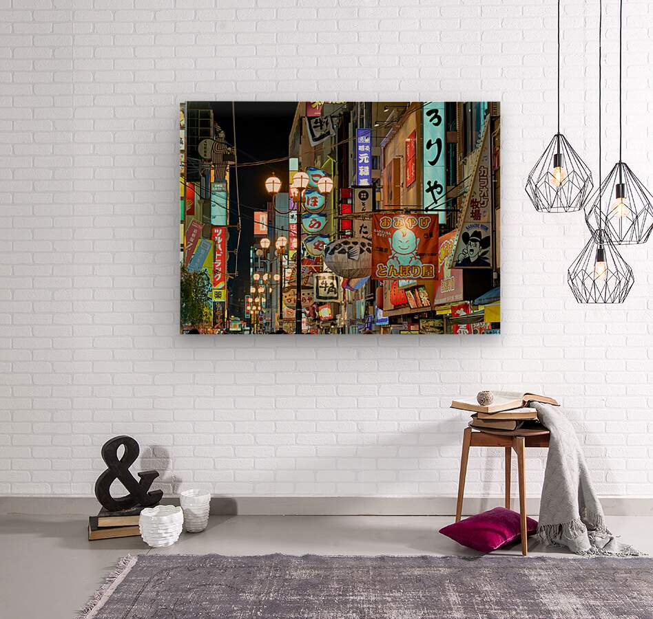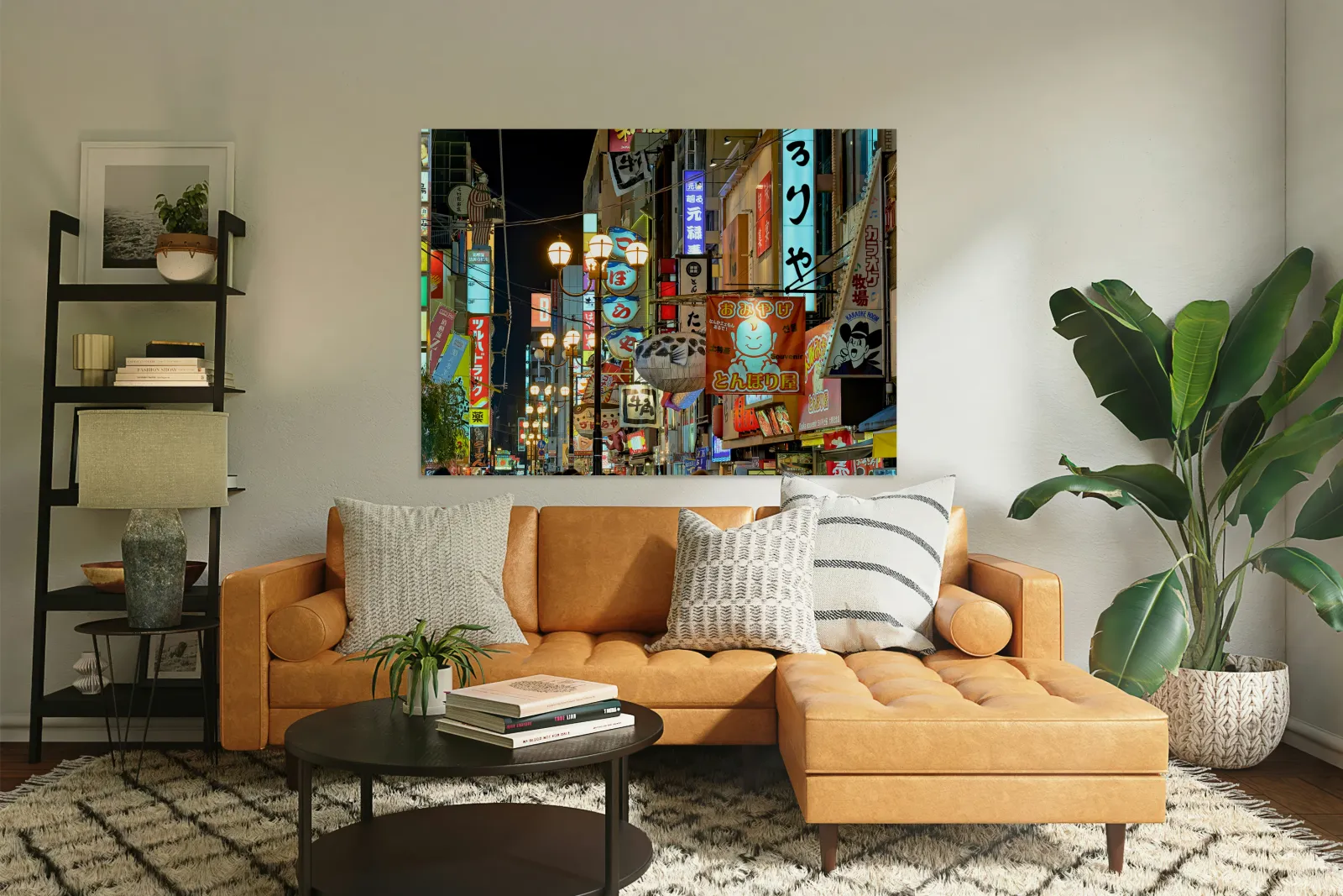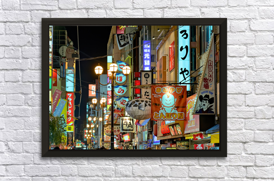 "Illuminated signboards in Dotonbori District at sunset in Osaka" in a framed print.