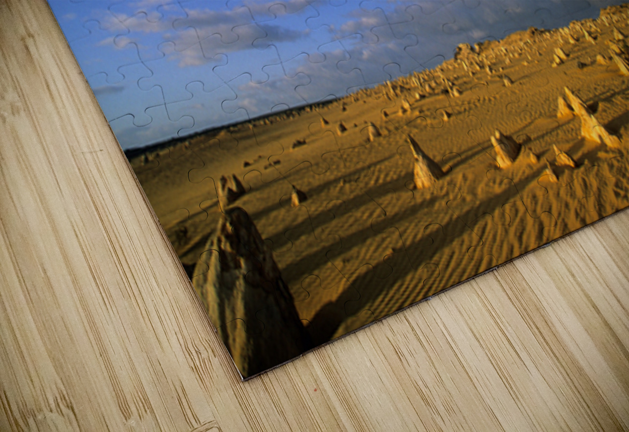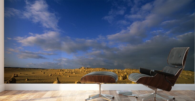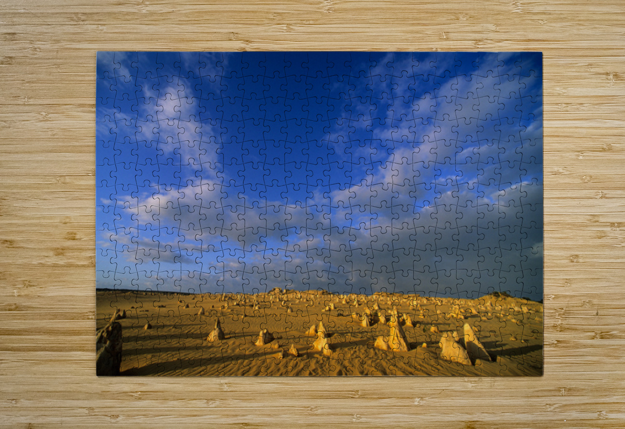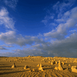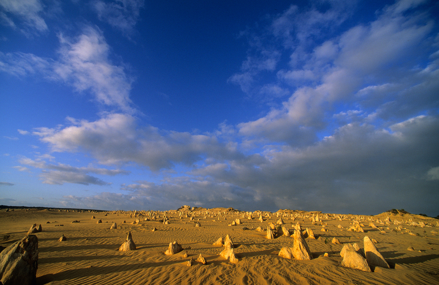 The Pinnacles Desert in Nambung National Park Western Australia. Thousands of limestone pillars rise from the shifting yellow sands.