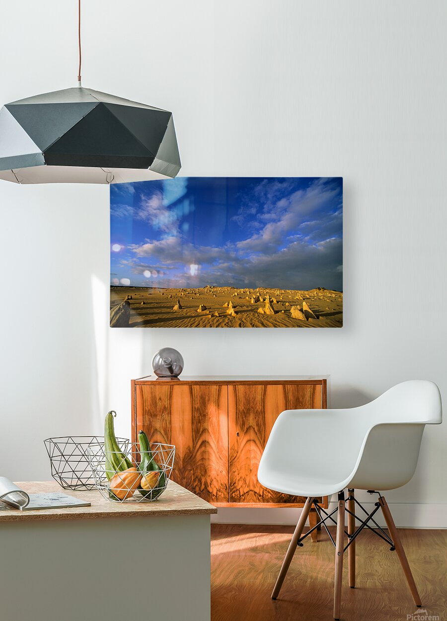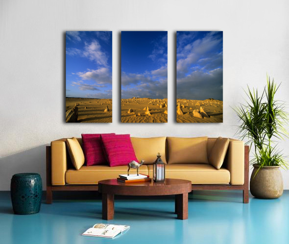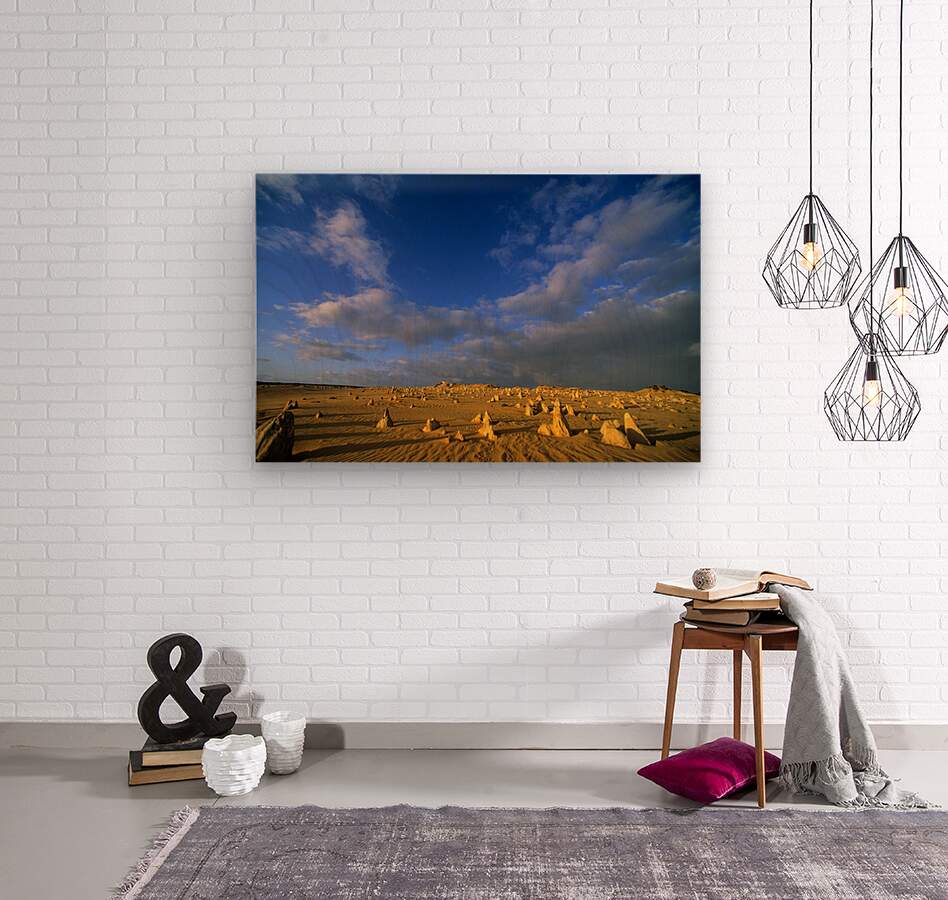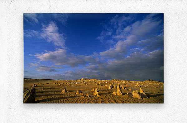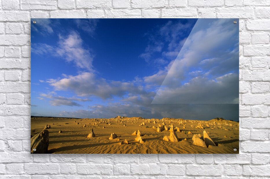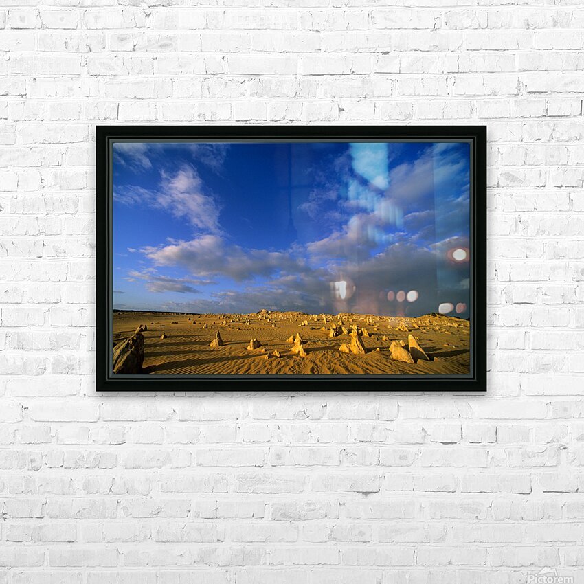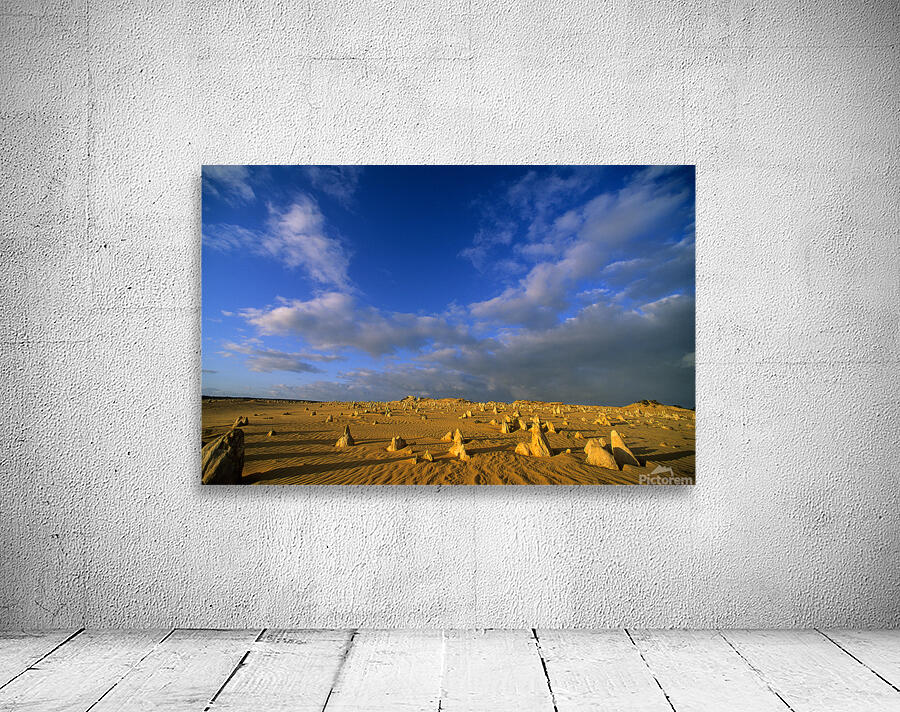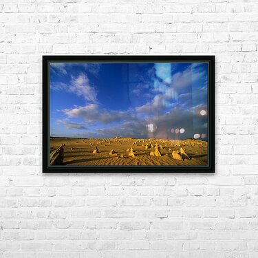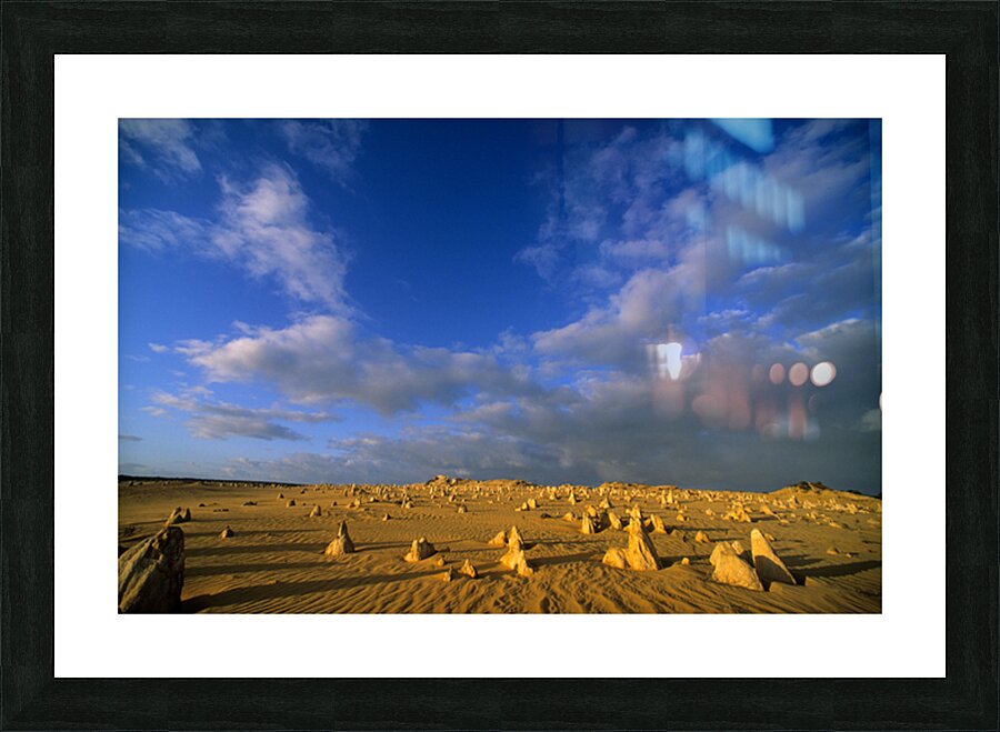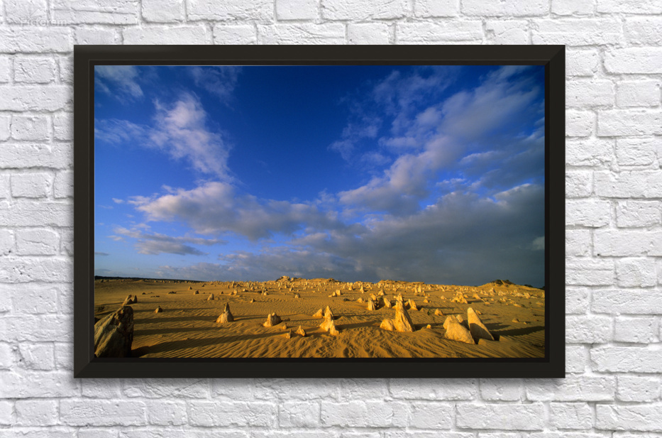 "The Pinnacles Desert limestone formations under a dramatic sky." in a framed print.