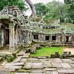 Overgrown ruins of Ta Prohm temple in Angkor Cambodia where giant trees embrace ancient stone illustrating natures powerful reclamation.