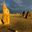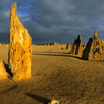 The Pinnacles Desert in Western Australia features limestone formations casting long shadows at sunset creating a dramatic desert landscape.