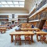 Students read and study in the library reading room at Mitchell Library in Sydney. They use books from extensive shelves around them.