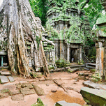 "Ancient temple ruins consumed by giant tree roots." in a framed print.