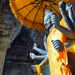 A multi-armed deity statue possibly Vishnu draped in yellow fabric under an umbrella within an ancient temple at Angkor Wat Cambodia.