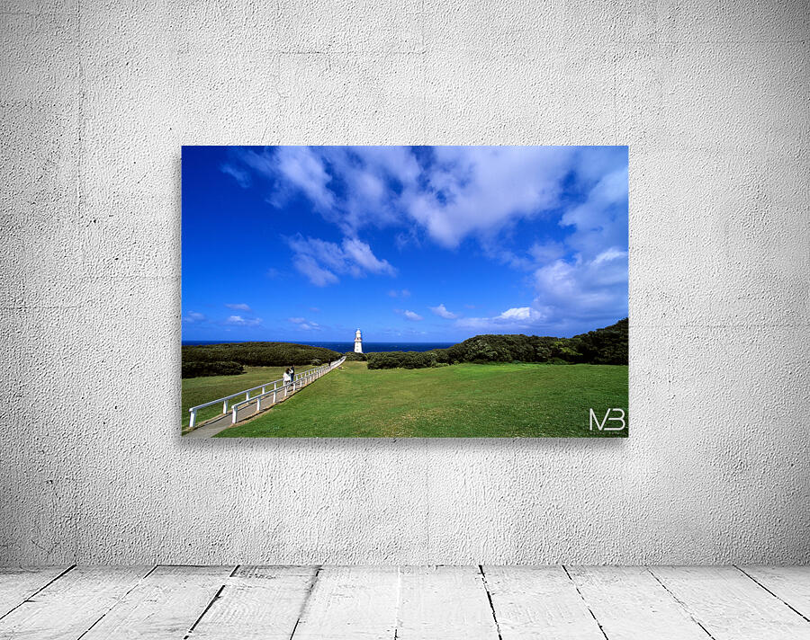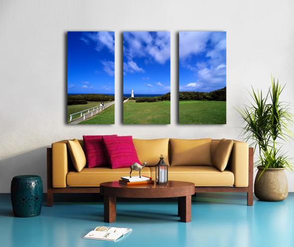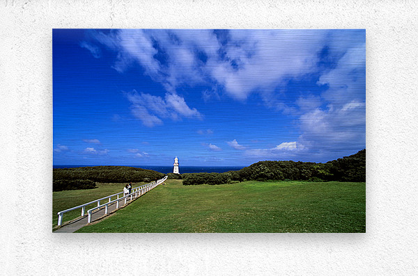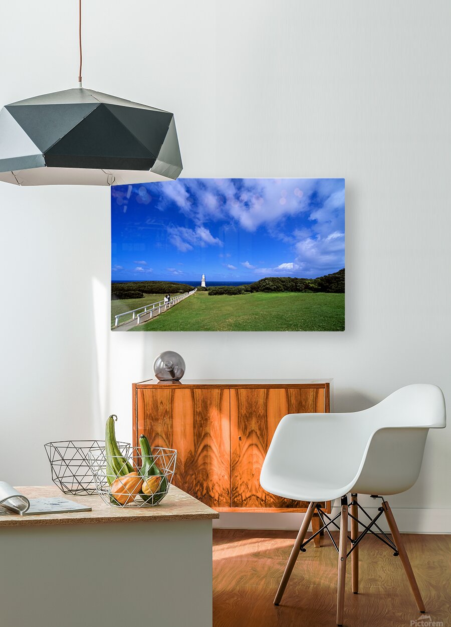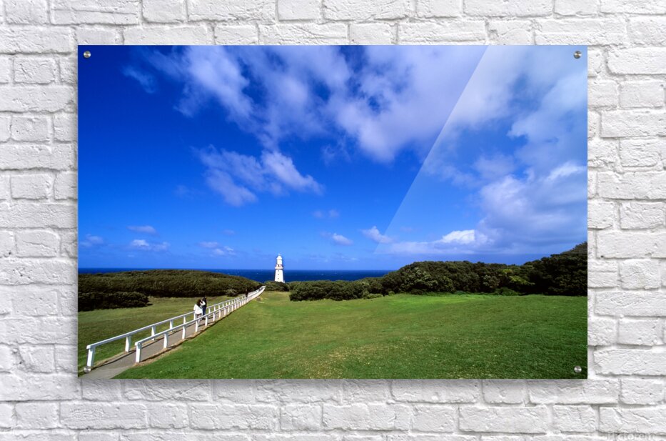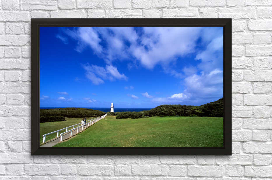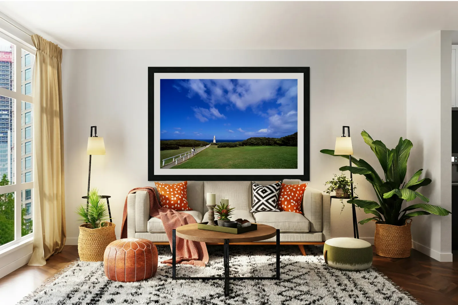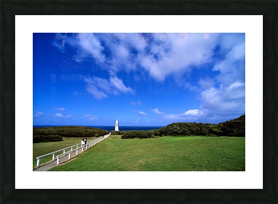 "A path leads to a coastal lighthouse under blue skies." in a framed print.