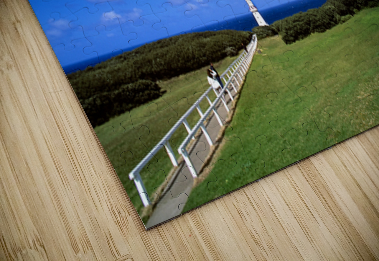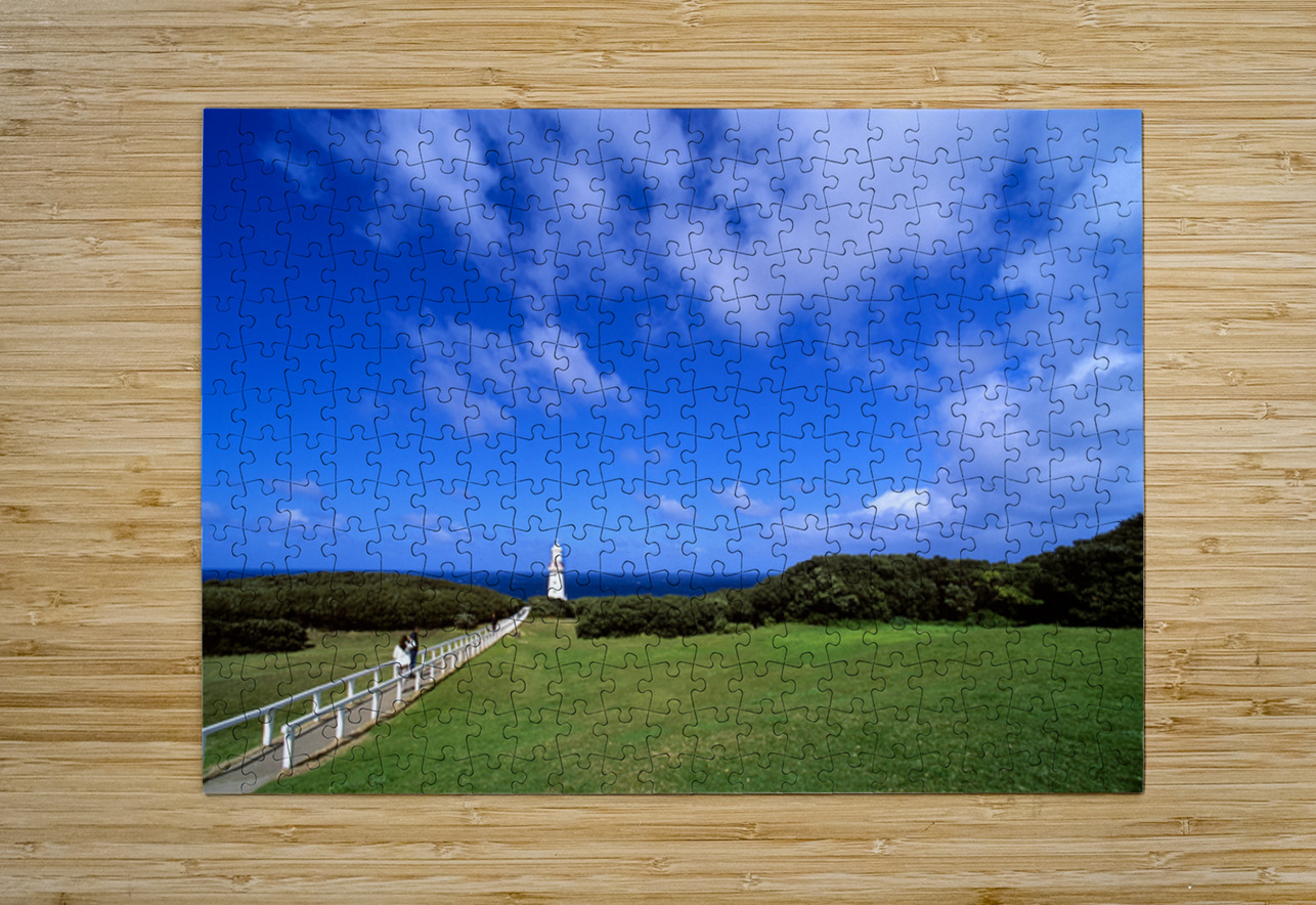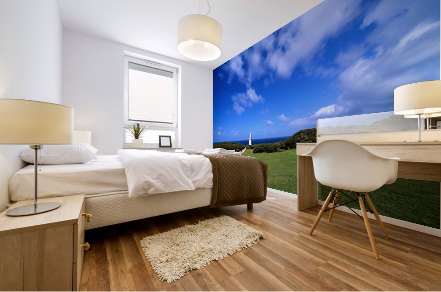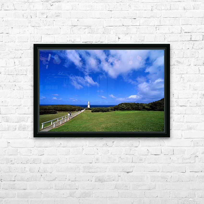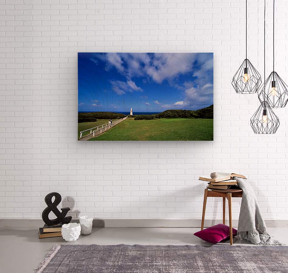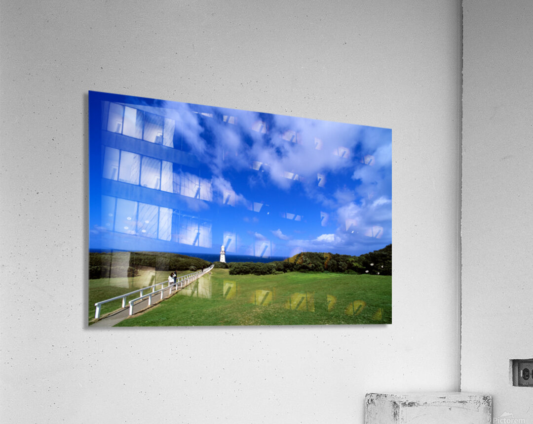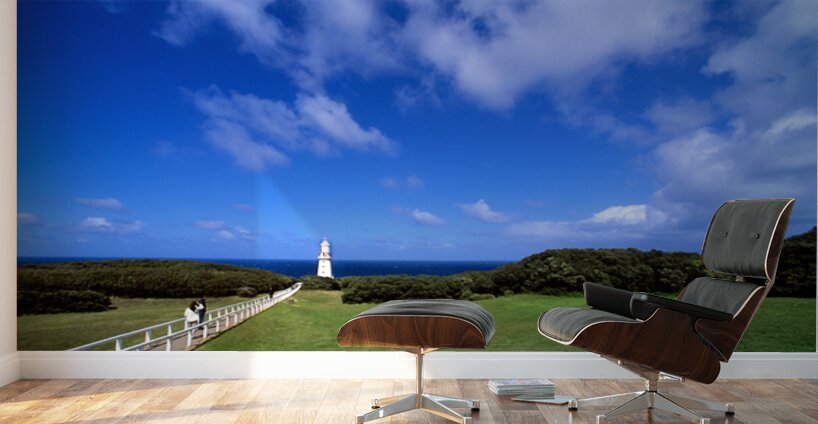 "A path leads to a coastal lighthouse under blue skies." in a framed print.
