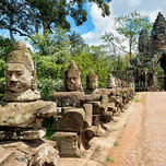 Stone statues of deities and asuras line the causeway leading to the South Gate of Angkor Thom Siem Reap Cambodia depicting the Churning of the Ocean