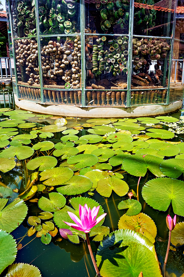 Deactivated landmines and ordnance displayed at a museum in Cambodia surrounded by a lotus pond symbolizing peace and the devastating legacy of war.
