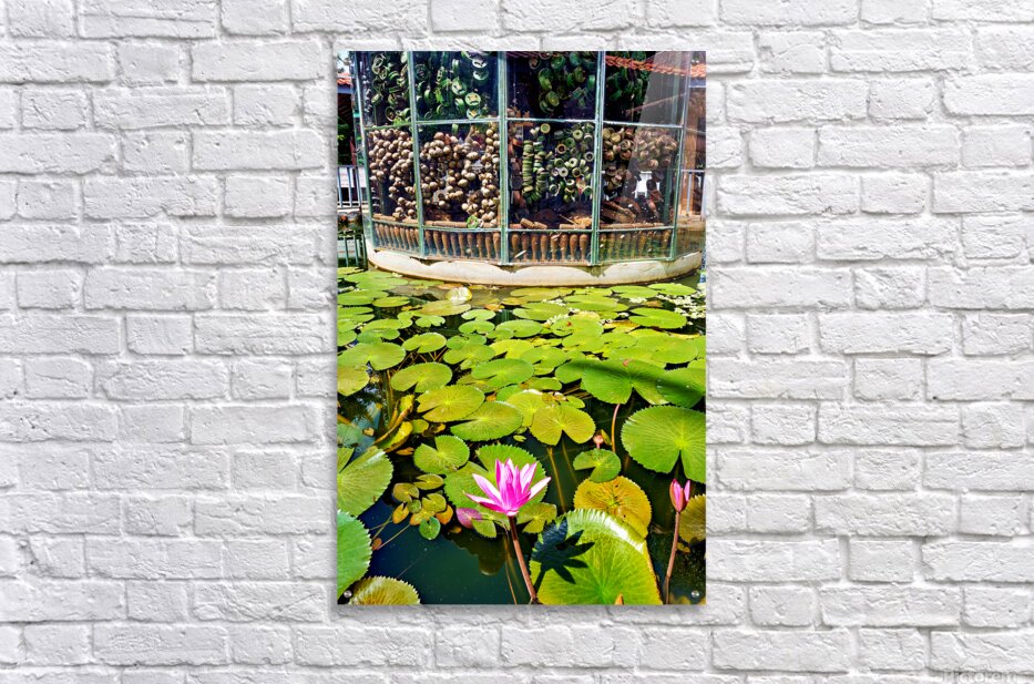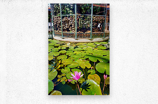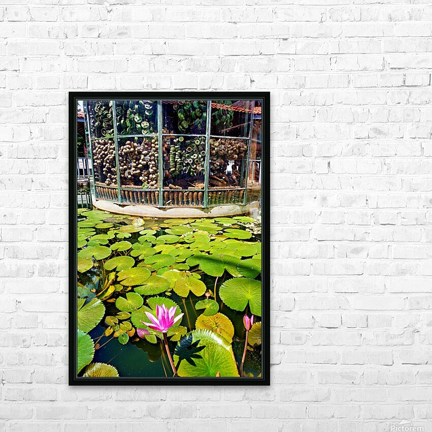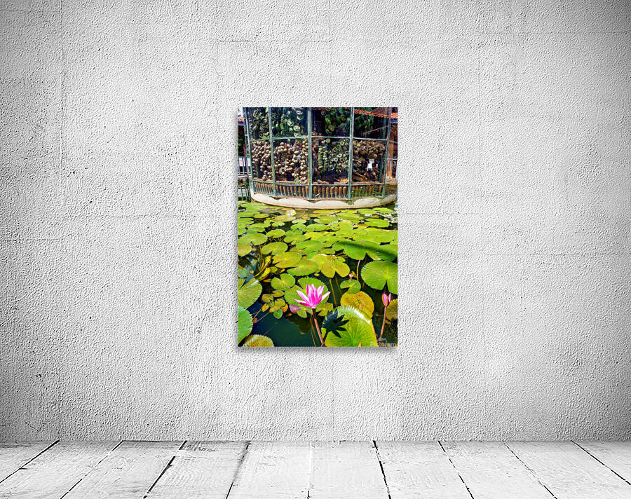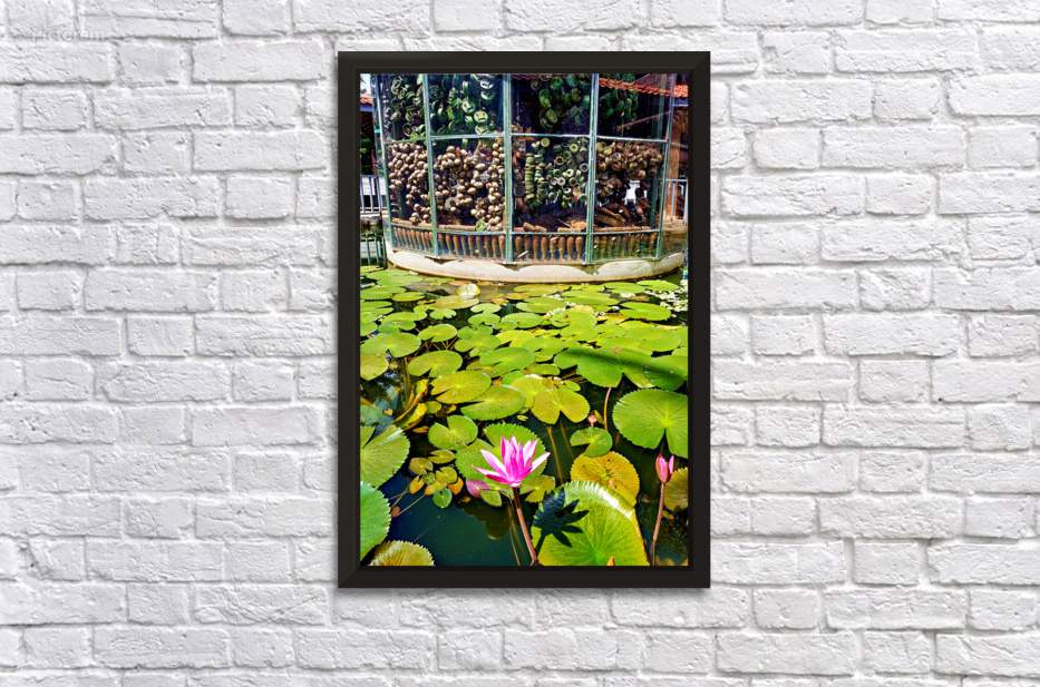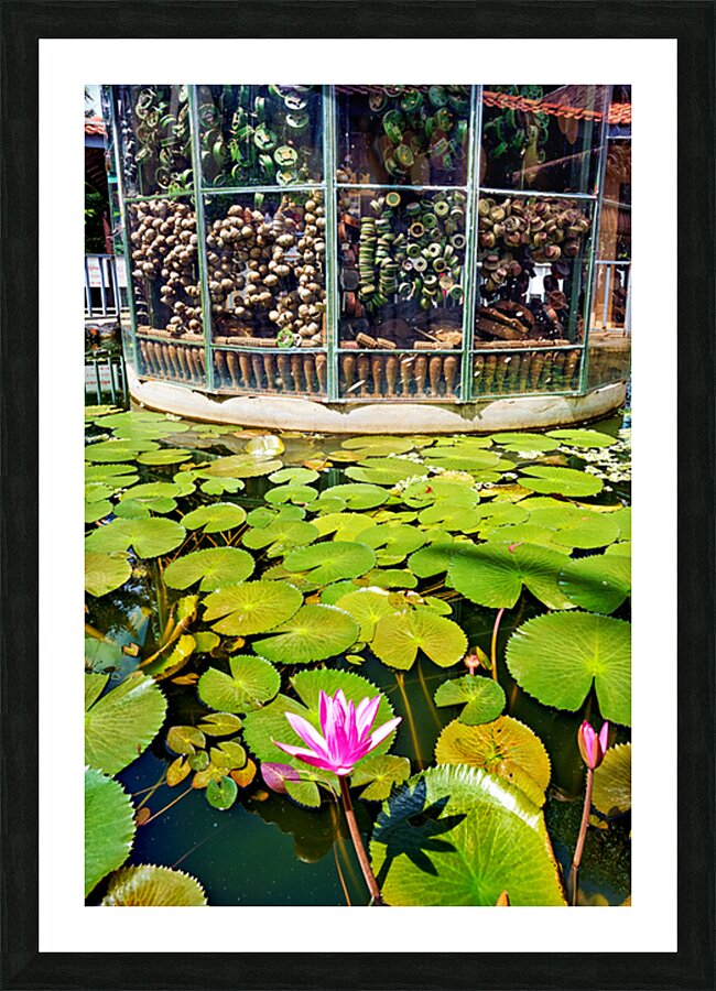 "Peaceful lotus pond contrasts with deactivated landmine display." in a framed print.