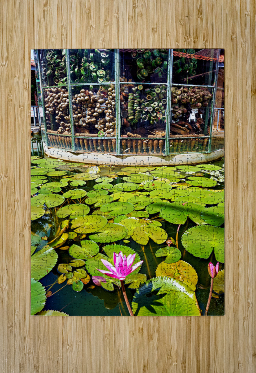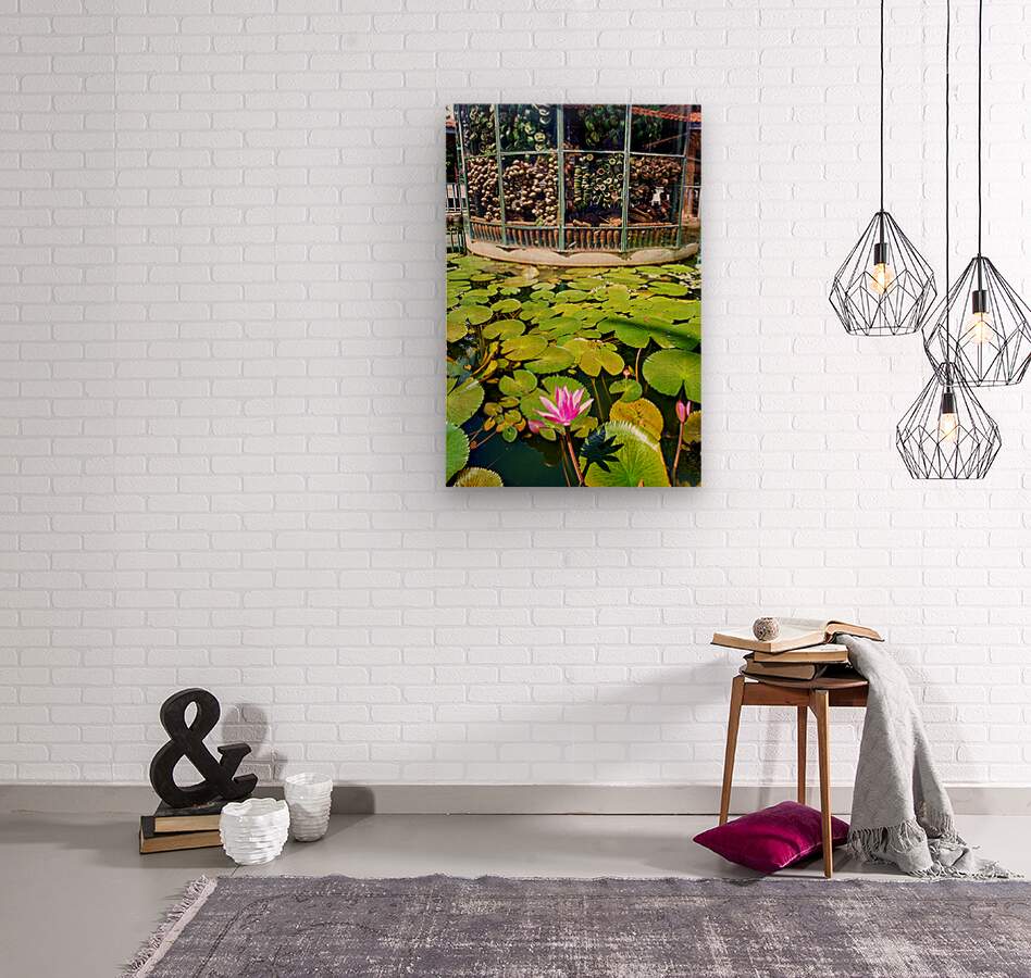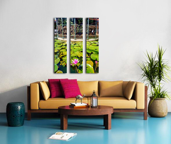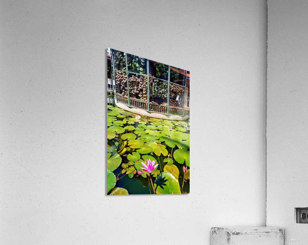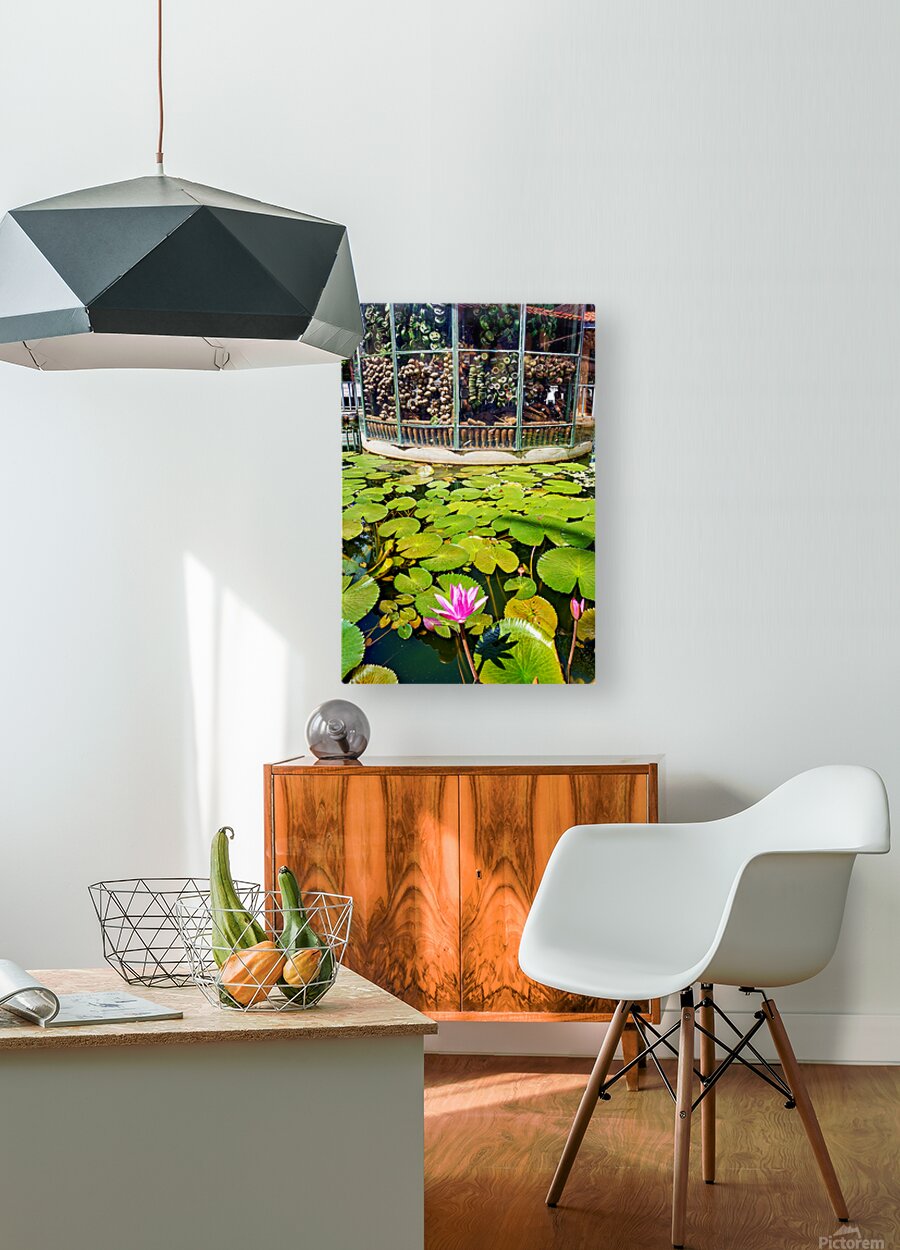 "Peaceful lotus pond contrasts with deactivated landmine display." in a framed print.