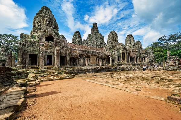 Tourists explore the ancient Bayon temple in Angkor Thom Cambodia admiring its iconic stone faces under a blue sky.