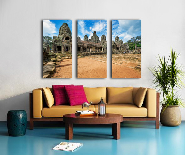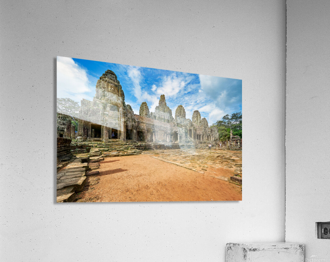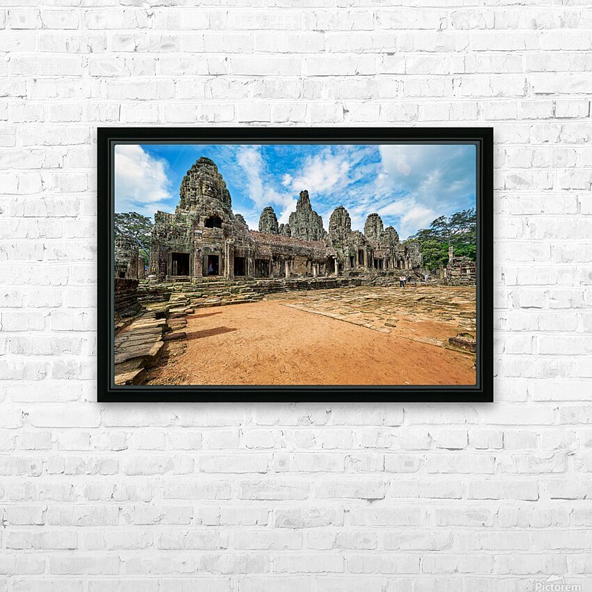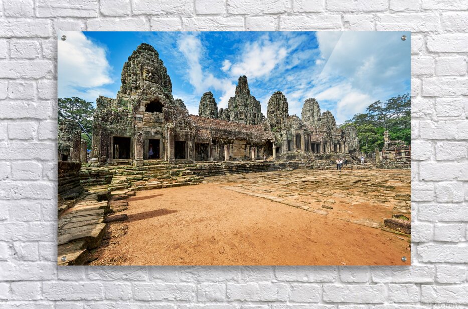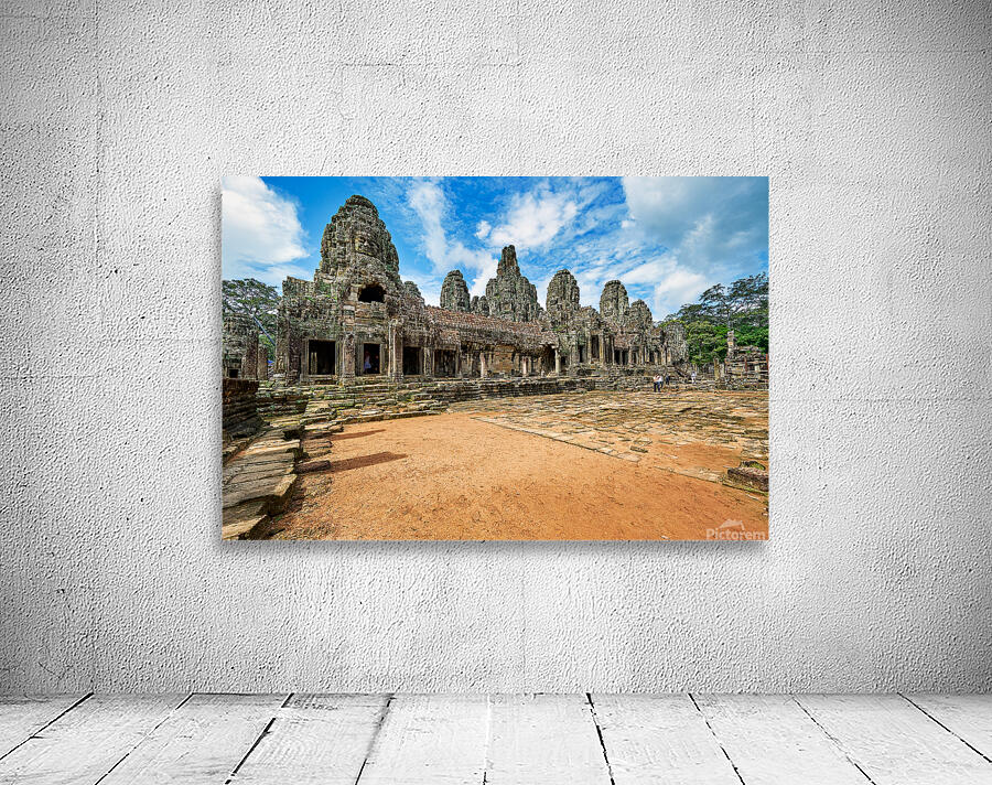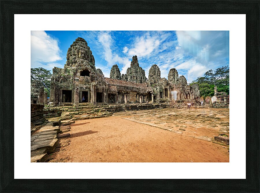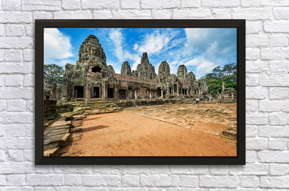 "Ancient Bayon temple with stone faces under a blue sky." in a framed print.