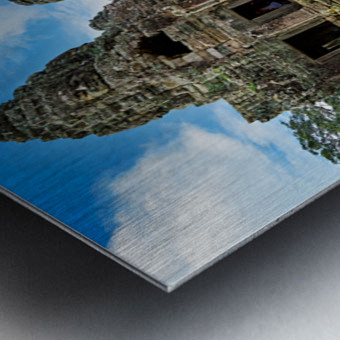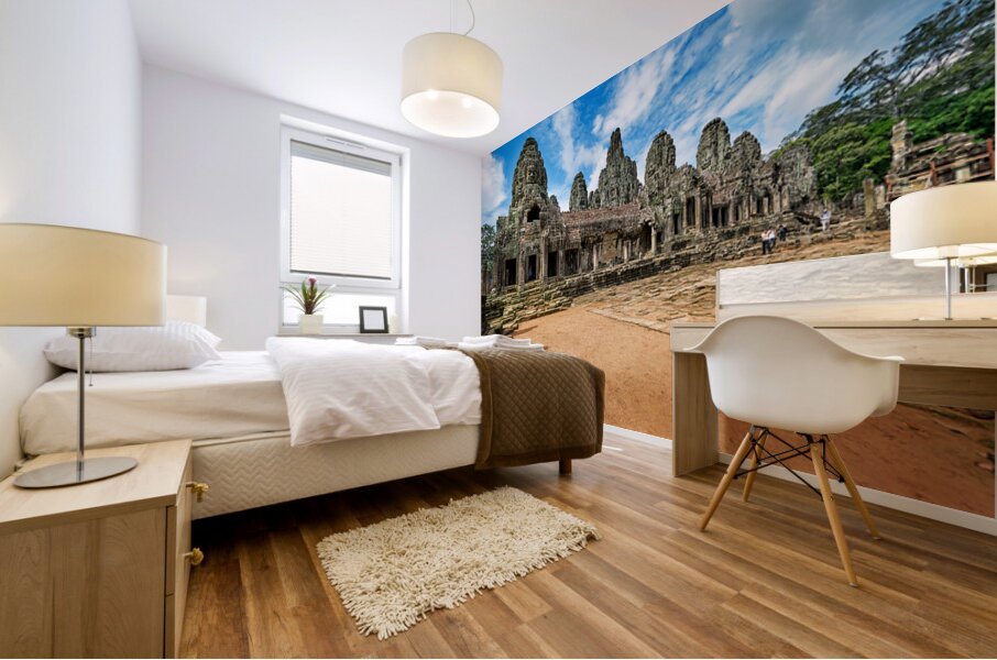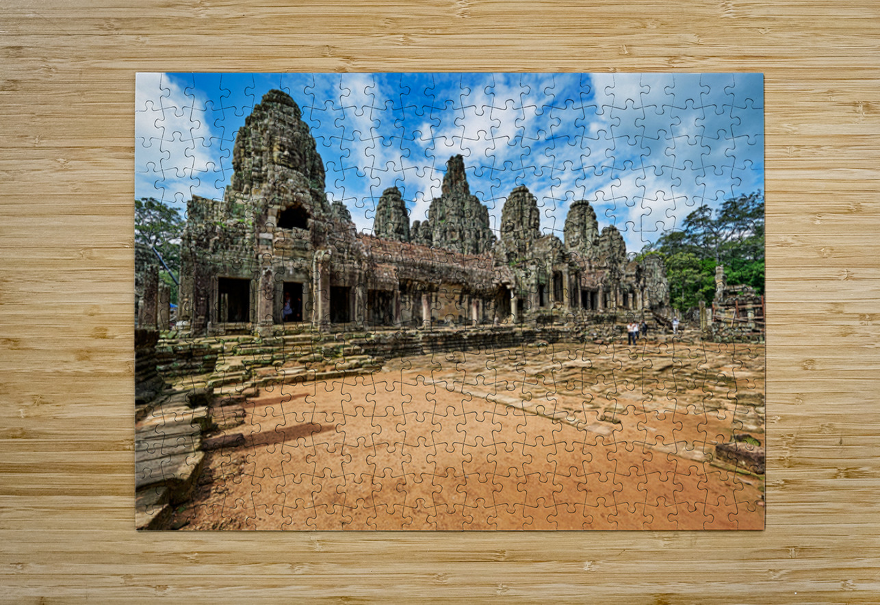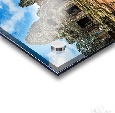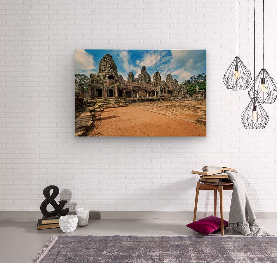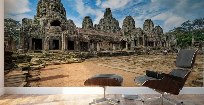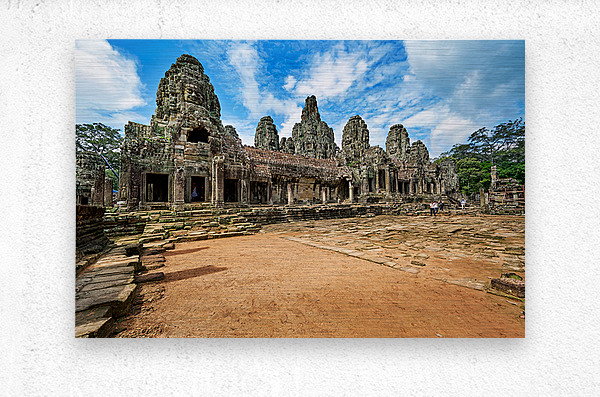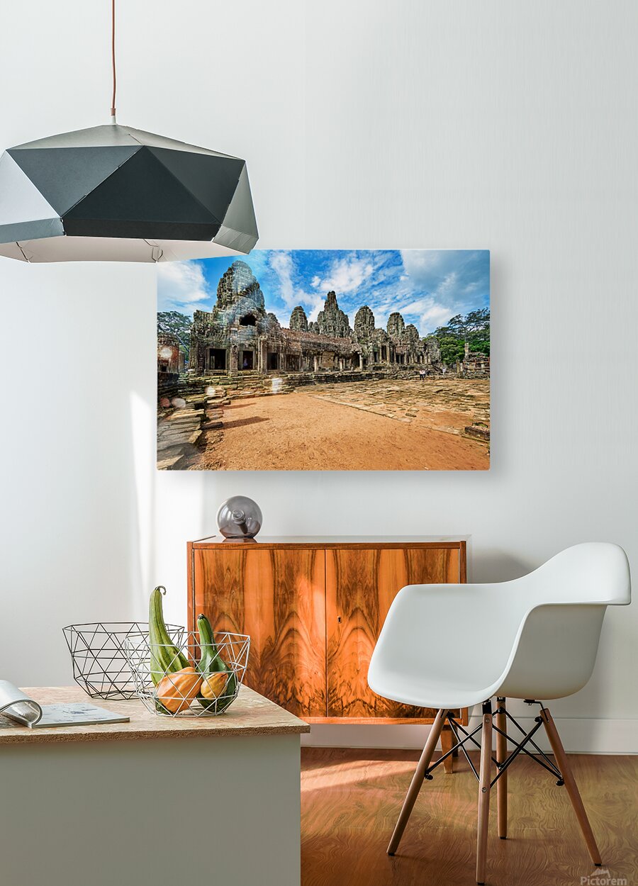 "Ancient Bayon temple with stone faces under a blue sky." in a framed print.