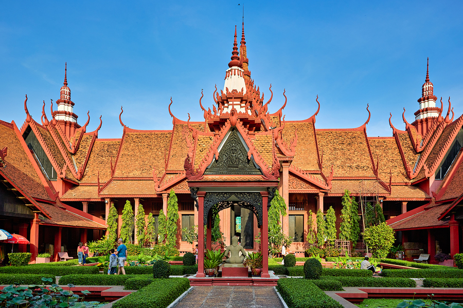 Visitors explore the National Museum of Cambodia in Phnom Penh admiring its traditional Khmer architecture and serene gardens.