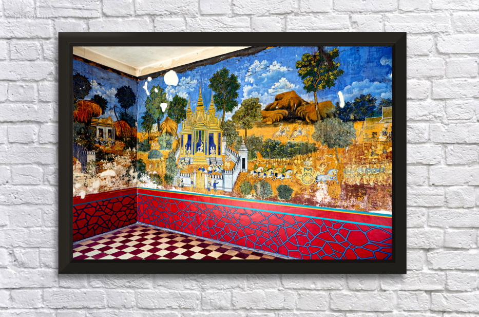 "Vibrant aged mural depicting traditional temple scenes with peo" in a framed print.