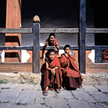Three playful young monks in Bhutan pose for a photo one making a funny face from behind a wooden railing. A candid moment of childhood joy.