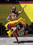 A dancer in a vibrant mask and traditional costume performs a sacred Cham dance captivating onlookers at a cultural festival in Bhutan.