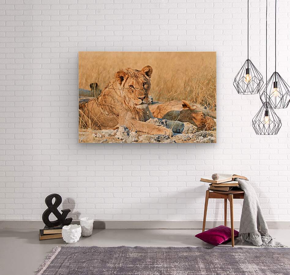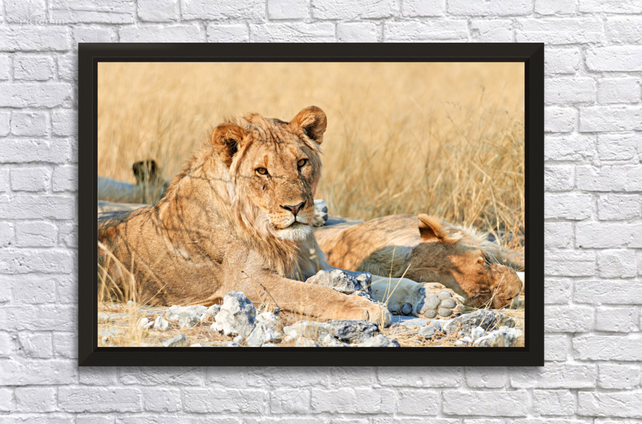 "Lion resting in Etosha National Park Namibia during daylight ho" in a framed print.