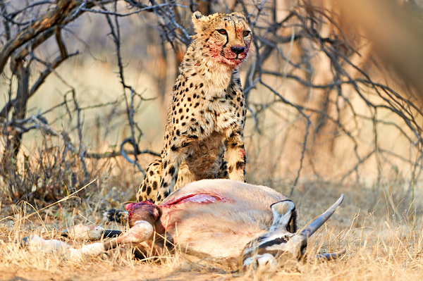 A cheetah stands over its kill in Okonjima Reserve Namibia. The sun shines through the trees as it eats its meal.