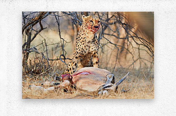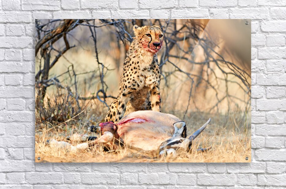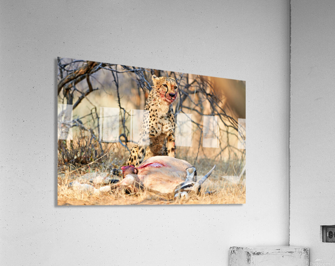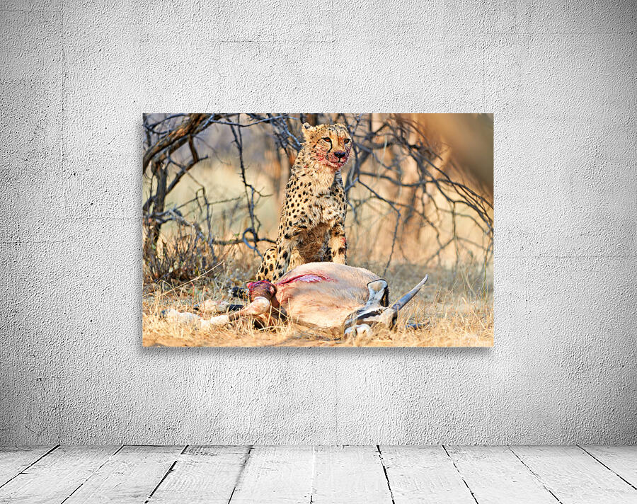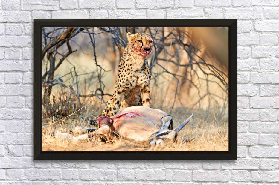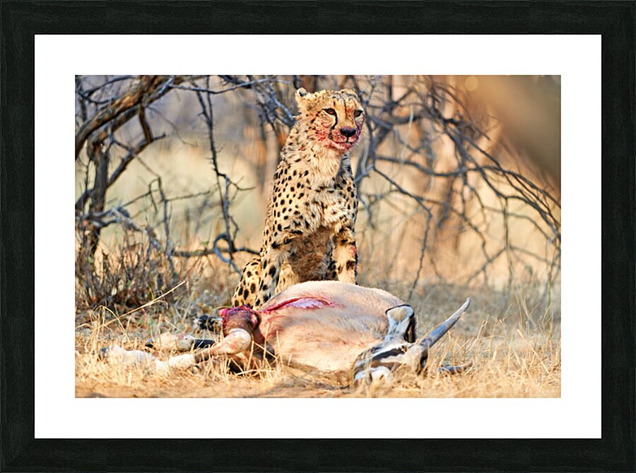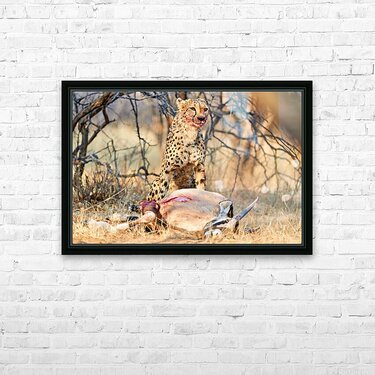 "Cheetah with prey at Okonjima Reserve in Namibia after hunt" in a framed print.