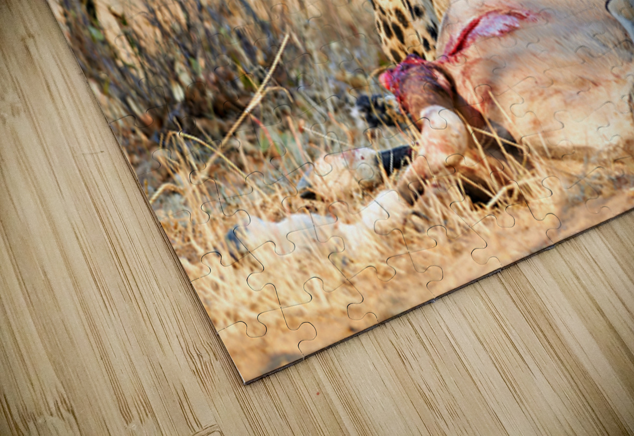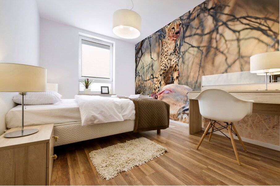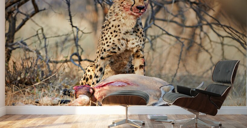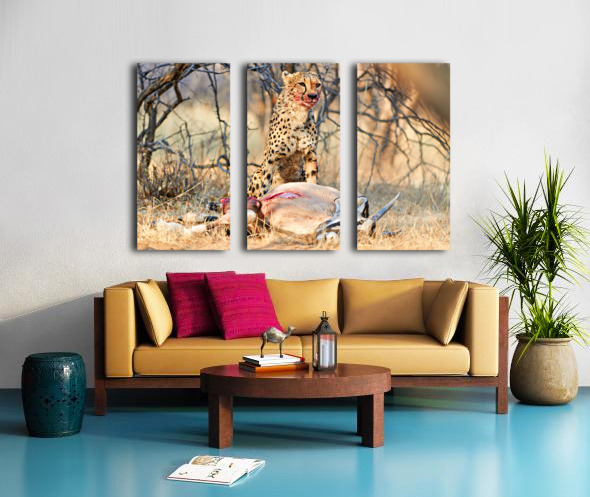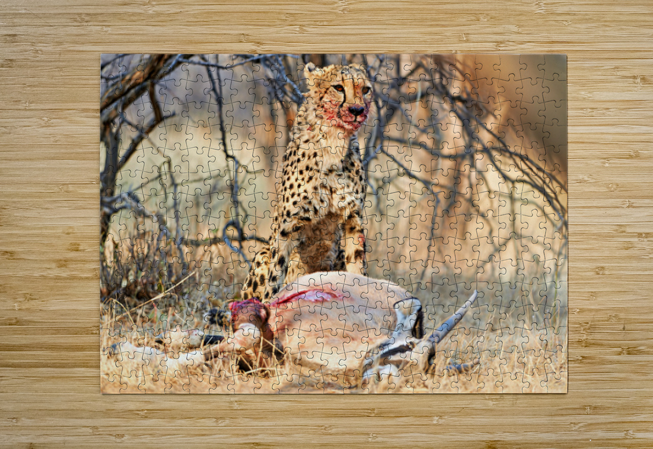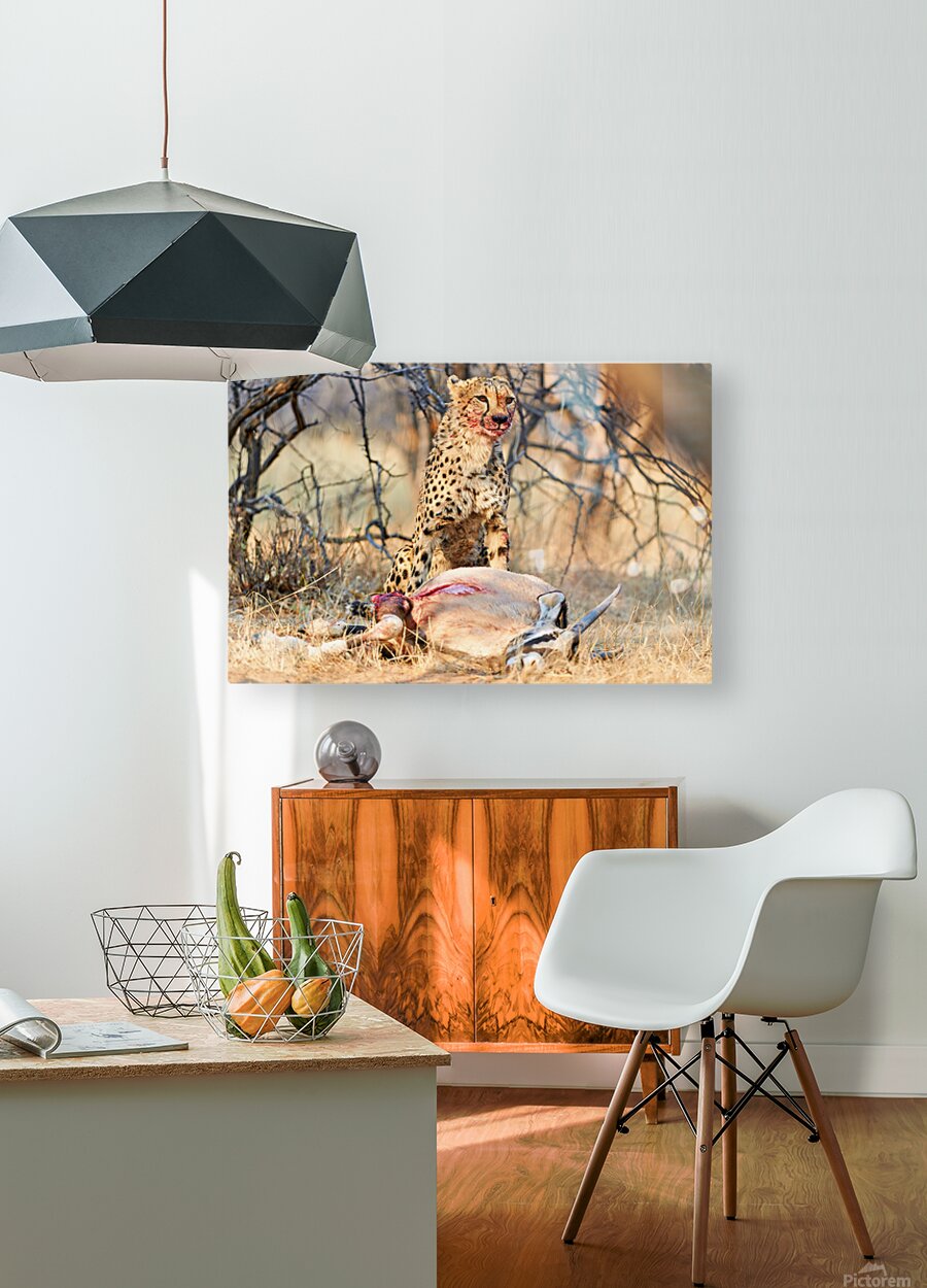 "Cheetah with prey at Okonjima Reserve in Namibia after hunt" in a framed print.