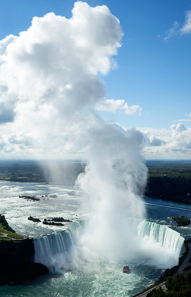 Tourists on a boat get up close to the powerful Horseshoe Falls at Niagara Falls Canada for an immersive experience of the natural wonder.