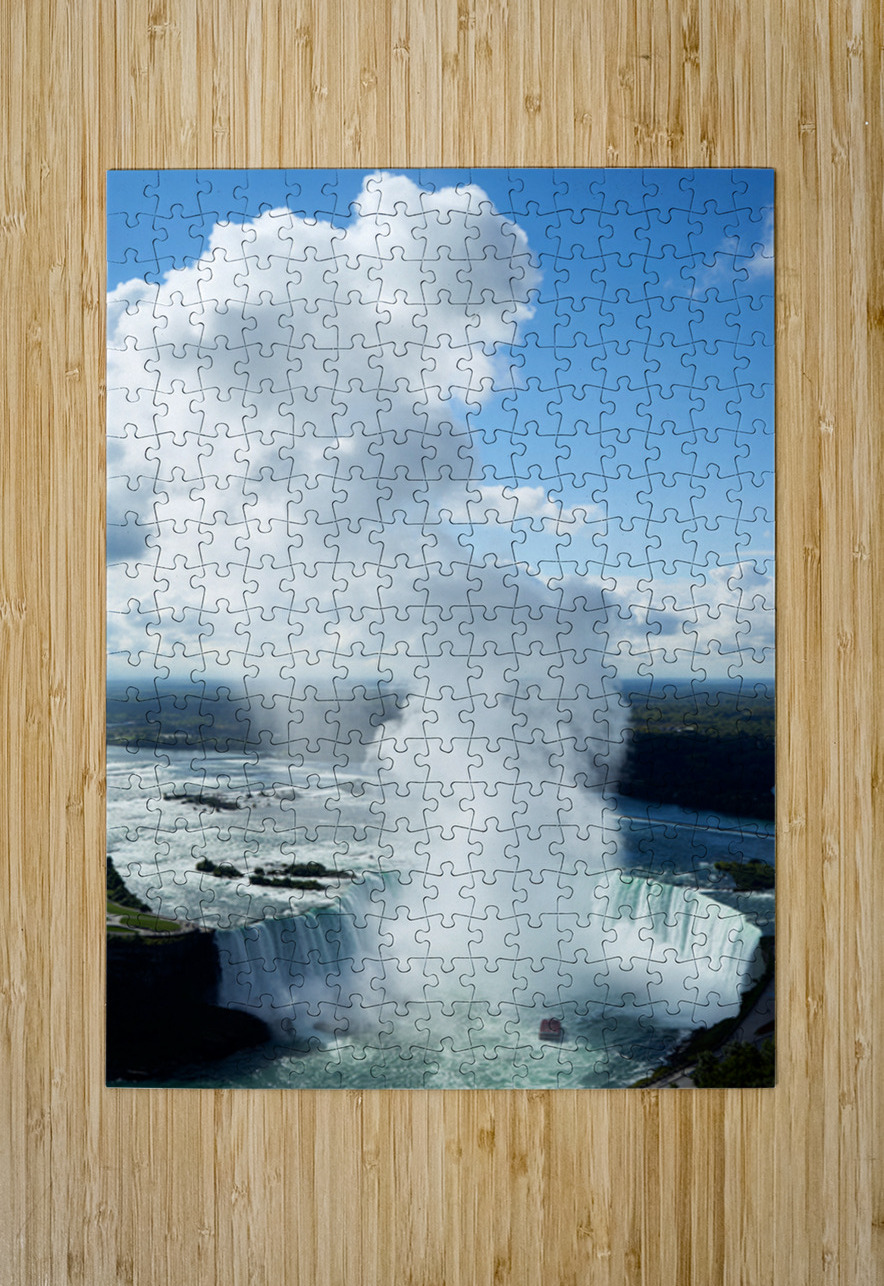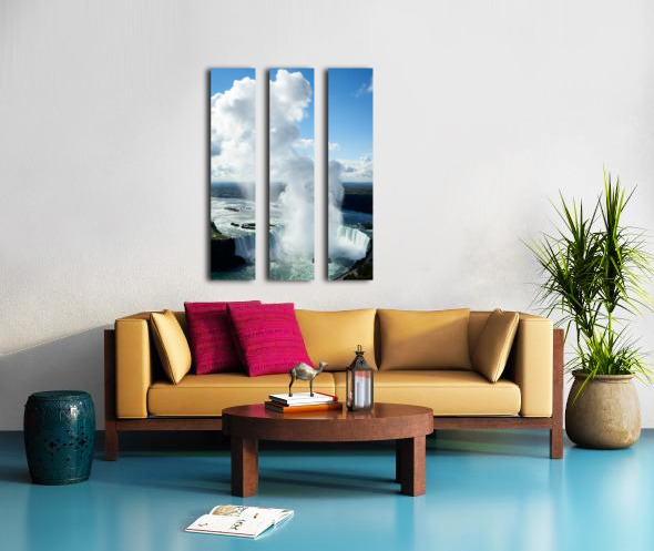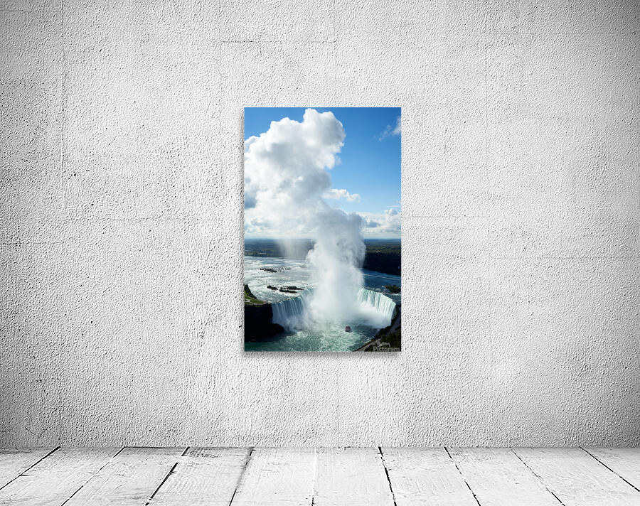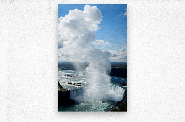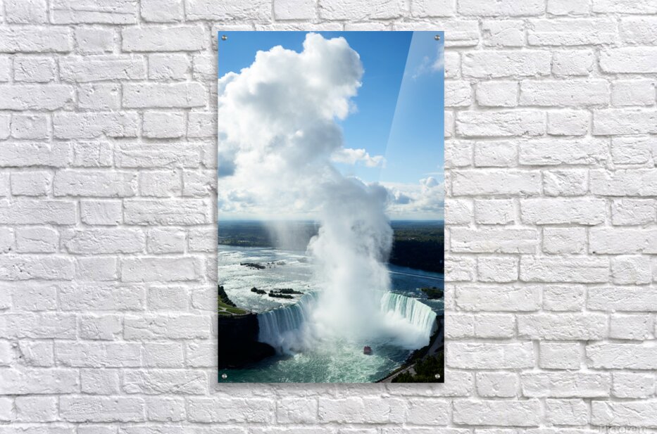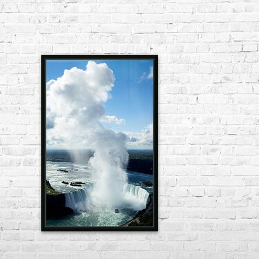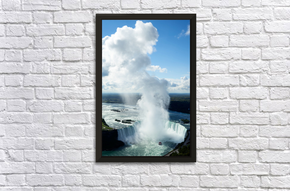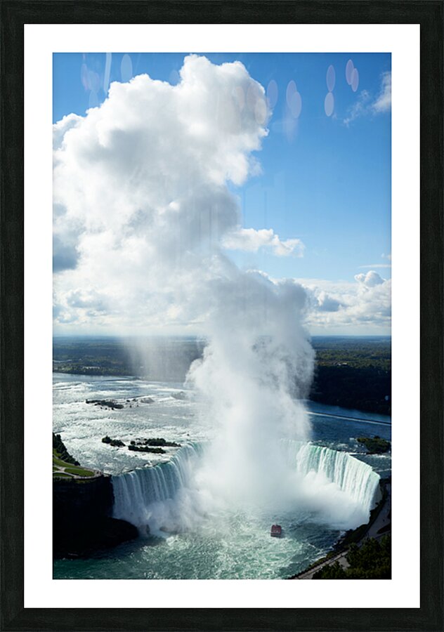 "Majestic Niagara Falls boat in mist blue sky." in a framed print.