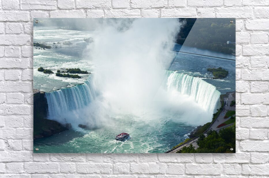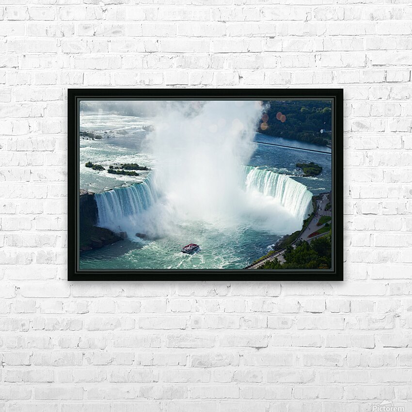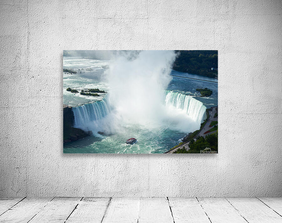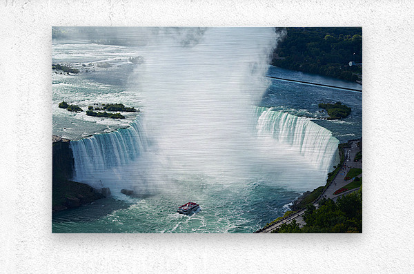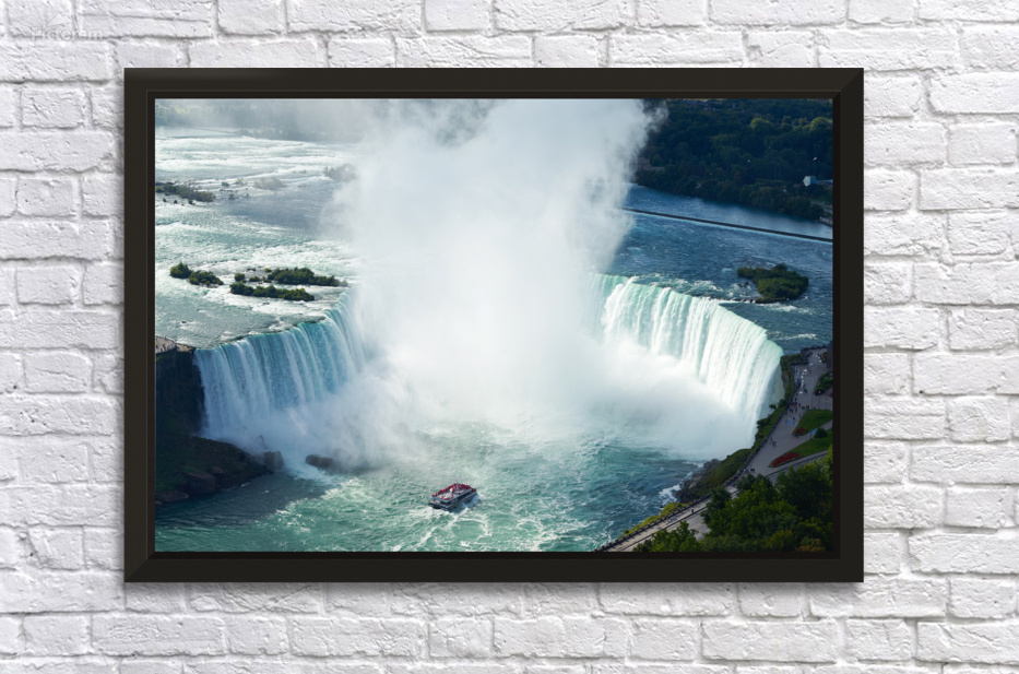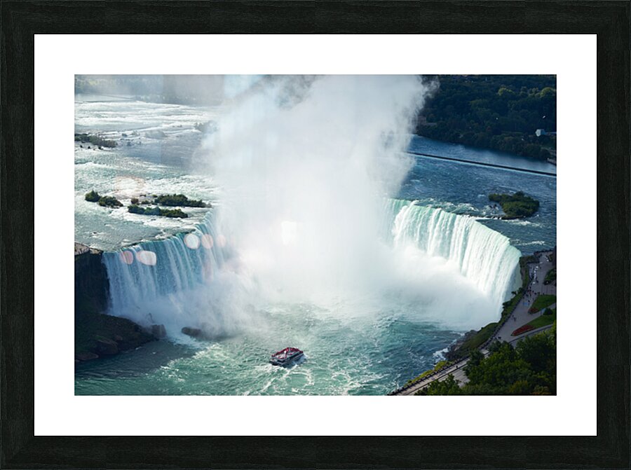 "Majestic Niagara Falls a boat braves the mist." in a framed print.