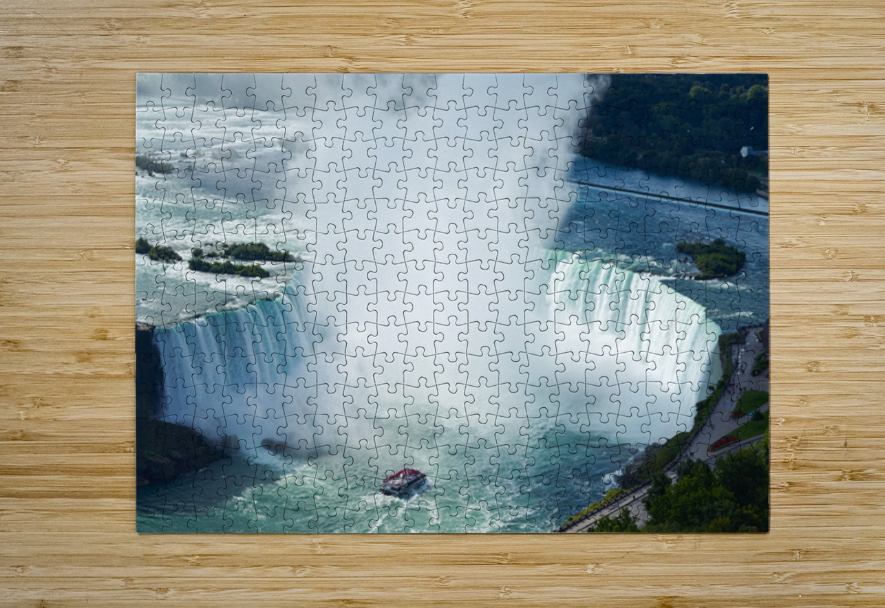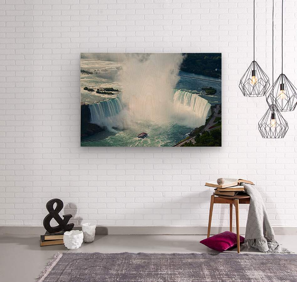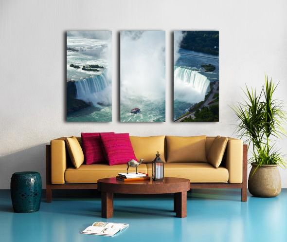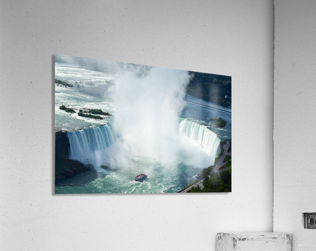 "Majestic Niagara Falls a boat braves the mist." in a framed print.