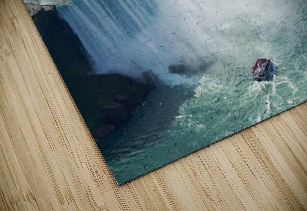 Tourists on a Hornblower boat brave the mist at Horseshoe Falls Niagara Falls Canada for an unforgettable close-up view of the powerful cascade.