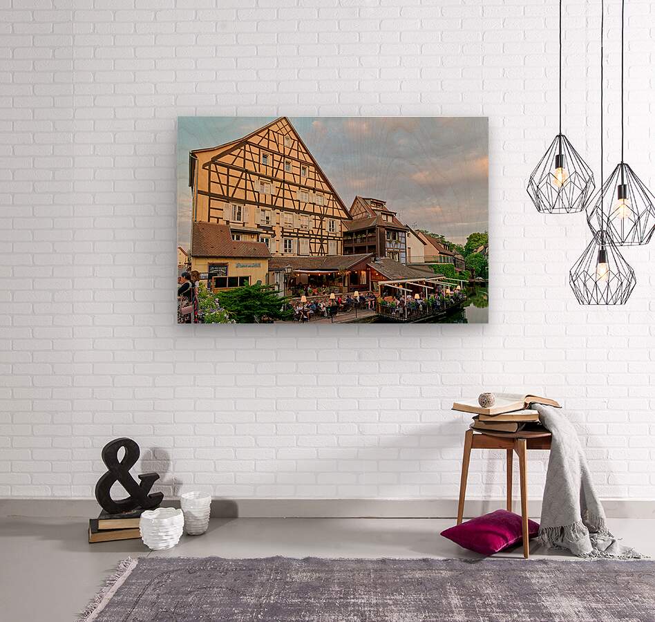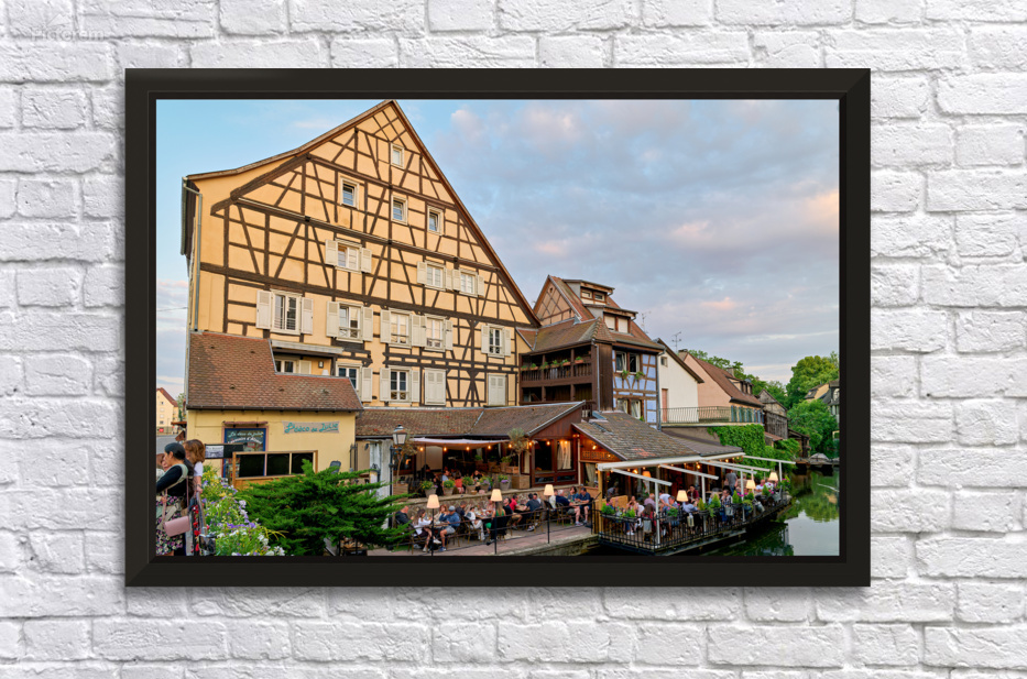"Dining by the canal in Colmar with timber framed houses in view" in a framed print.