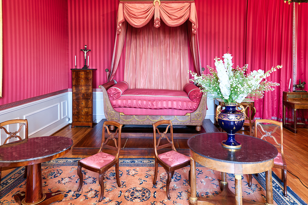 Visitors walk through the colorful room in Chateau dAmboise admiring its design and furniture details during their tour.