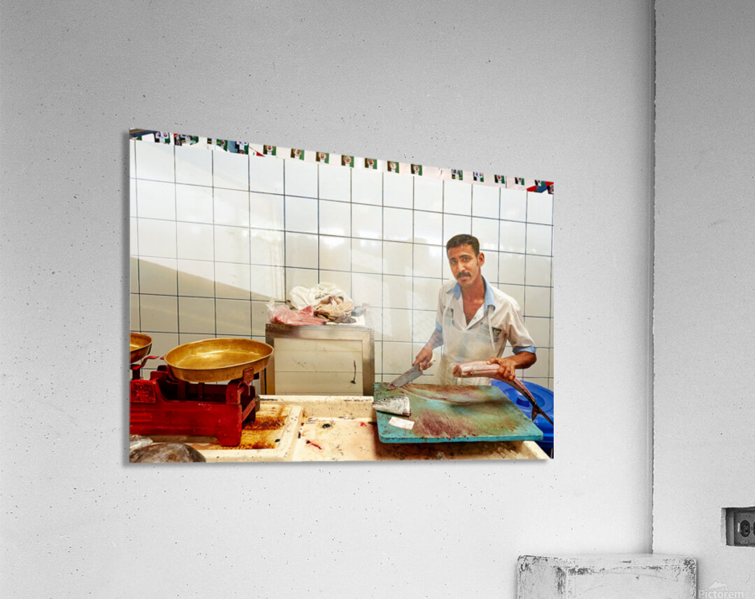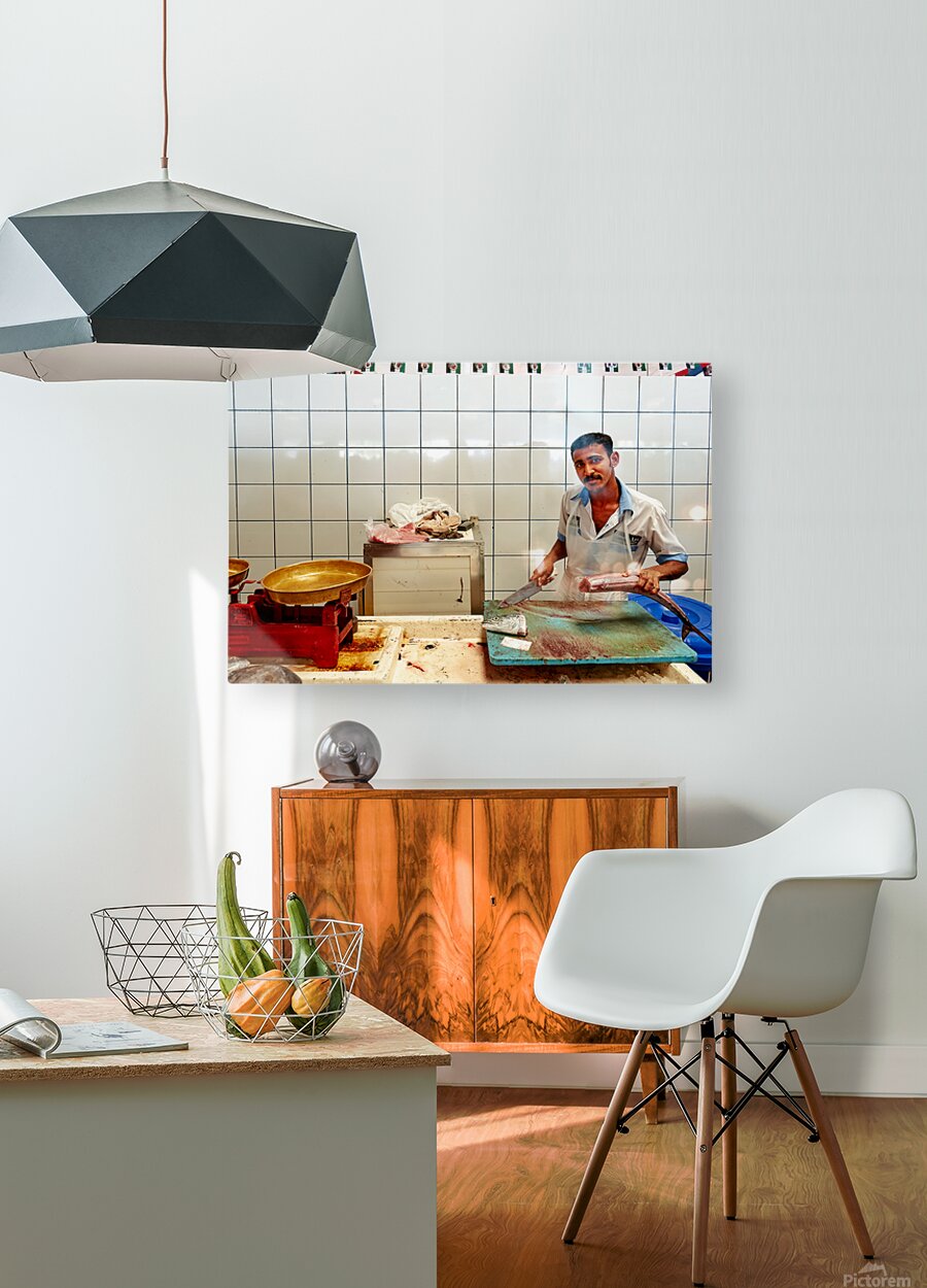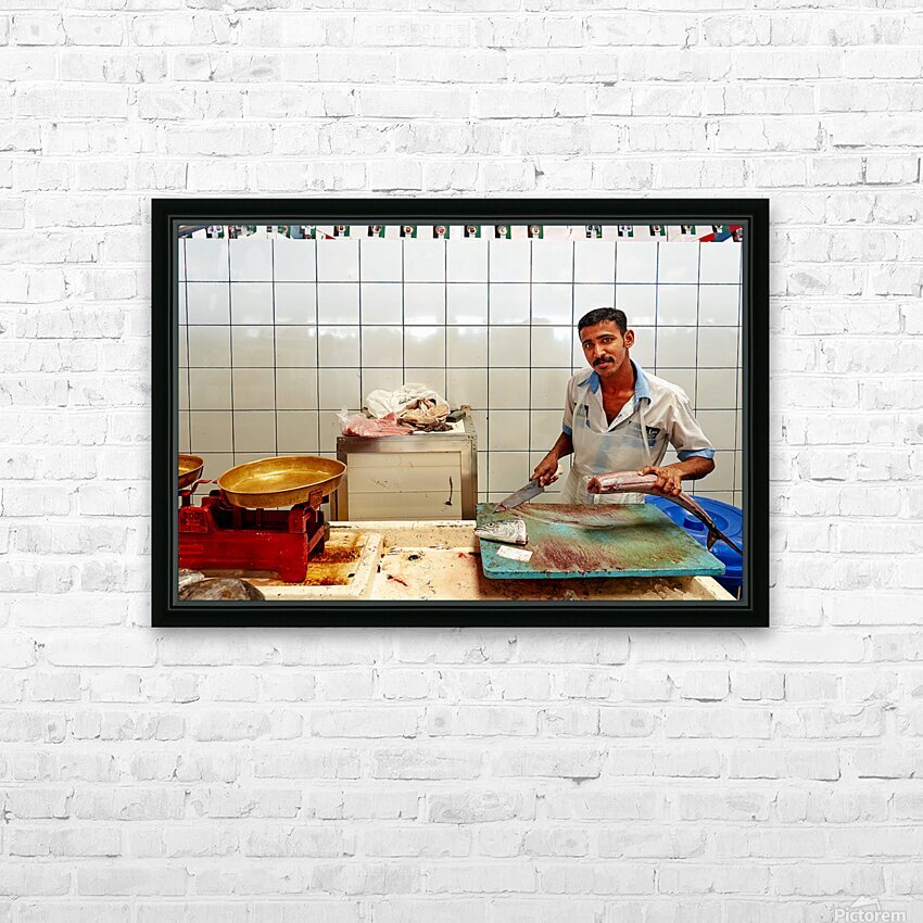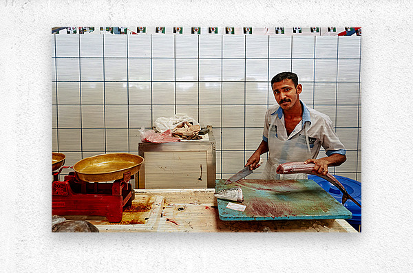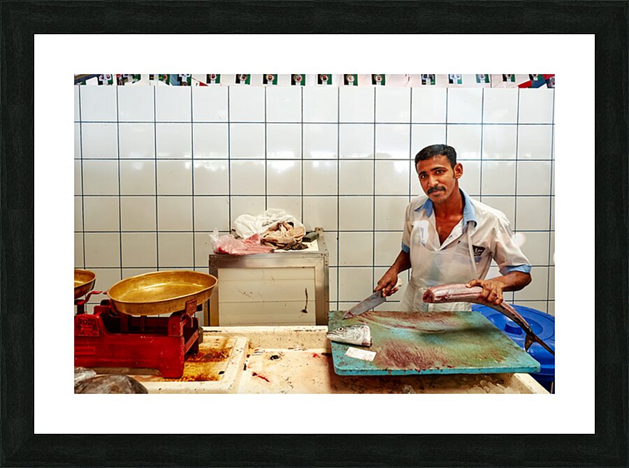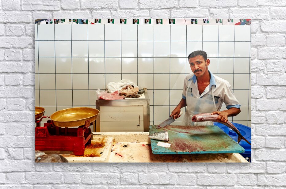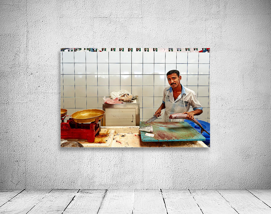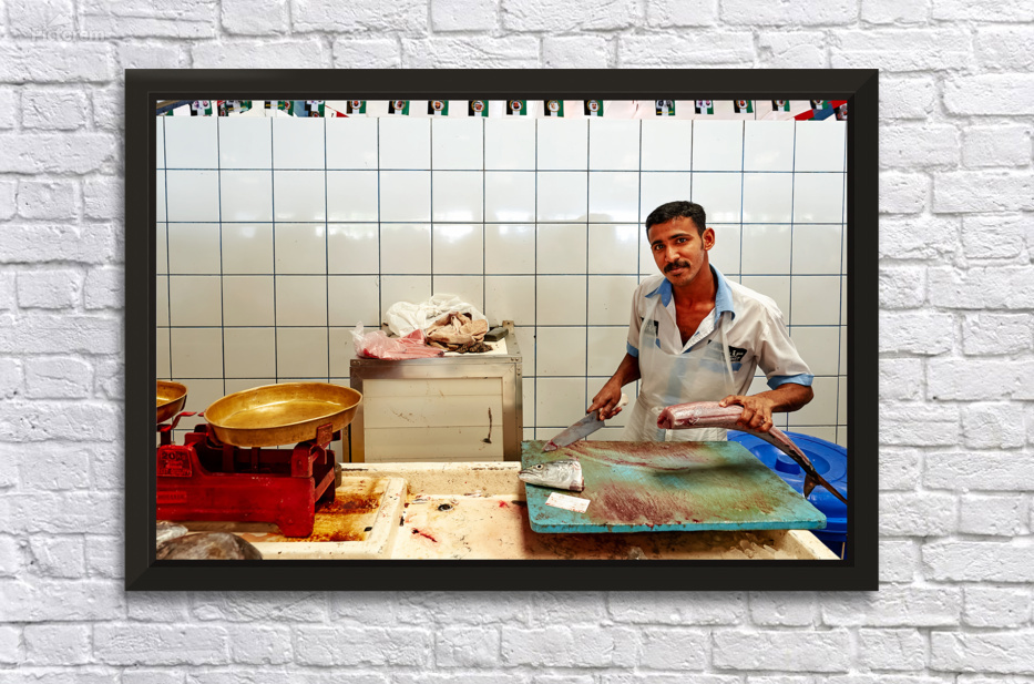 "Man cuts fish at a market stall in Dubai during daylight hours" in a framed print.