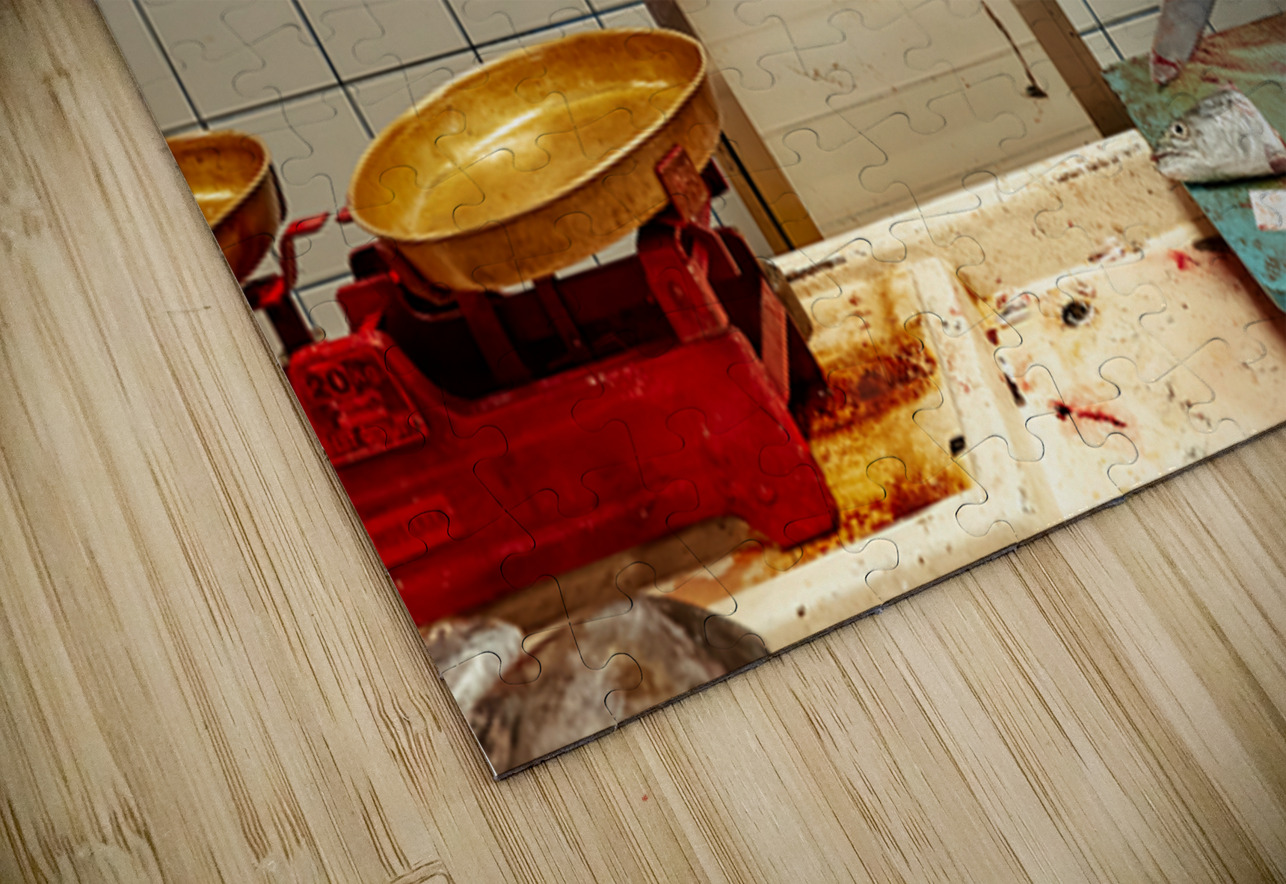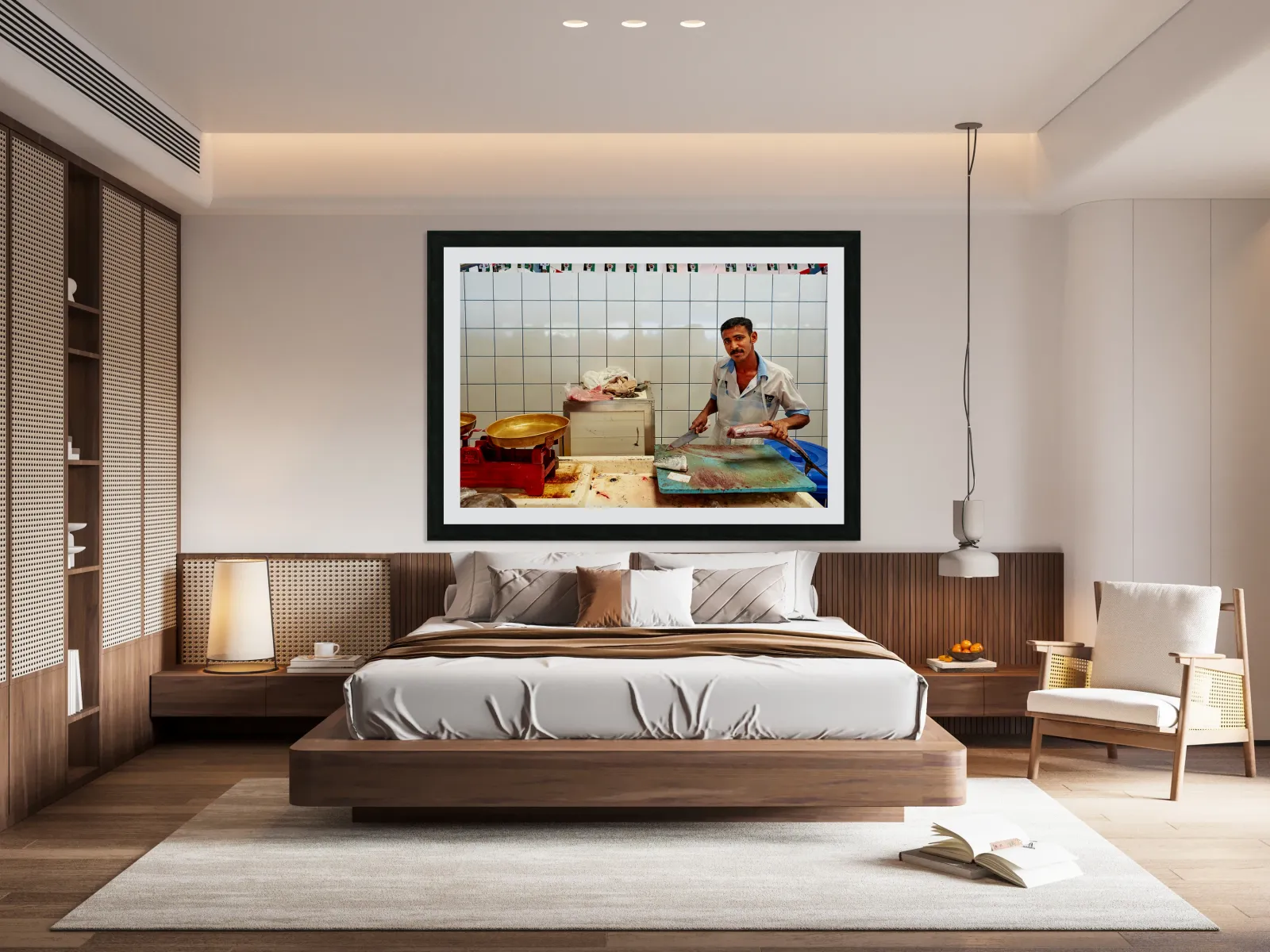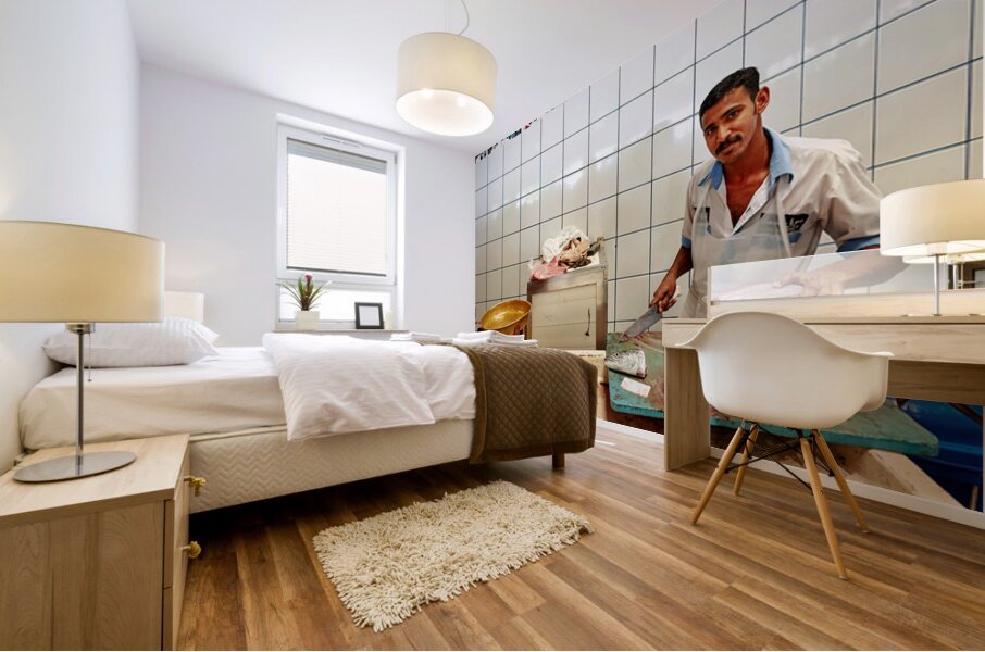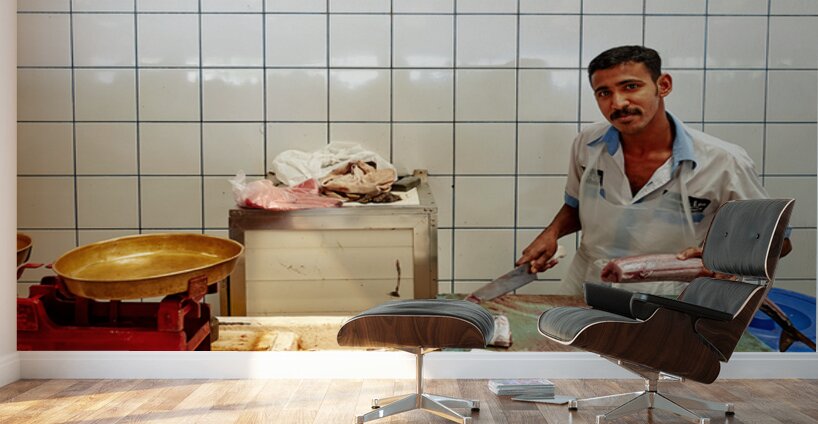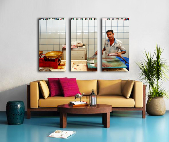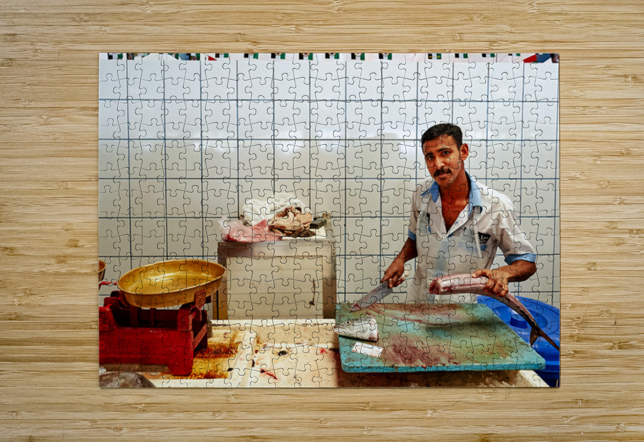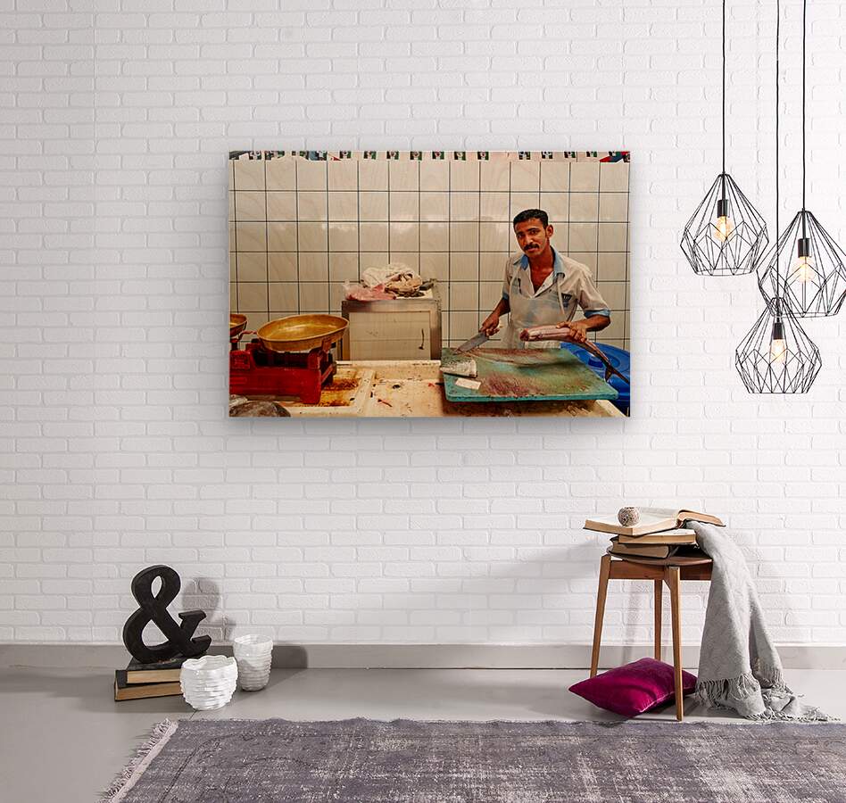 "Man cuts fish at a market stall in Dubai during daylight hours" in a framed print.