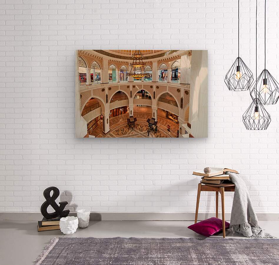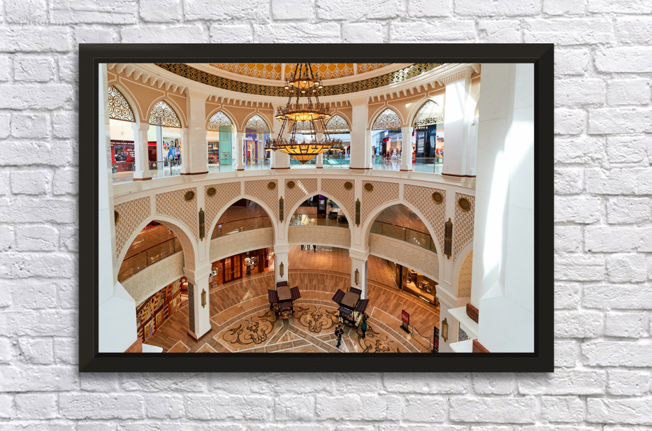 "Explore grand shopping mall interior in Dubai with multiple leve" in a framed print.