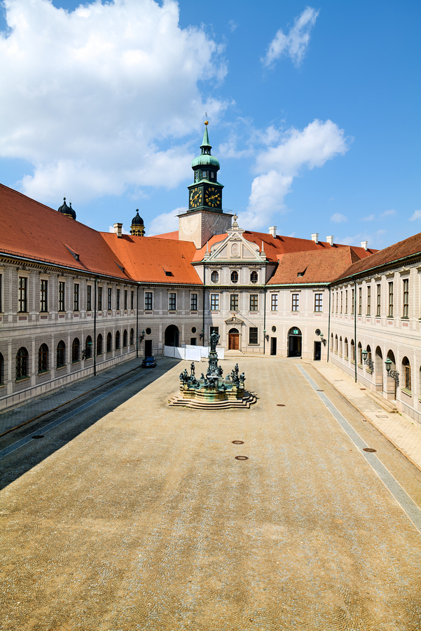 Residenz Palace stands in the center of Munich showcasing its architecture and courtyard during a sunny day with a fountain in view.