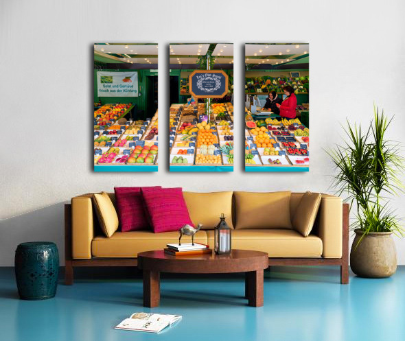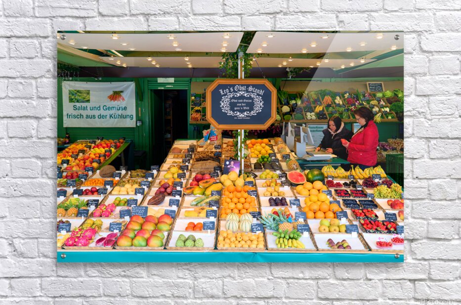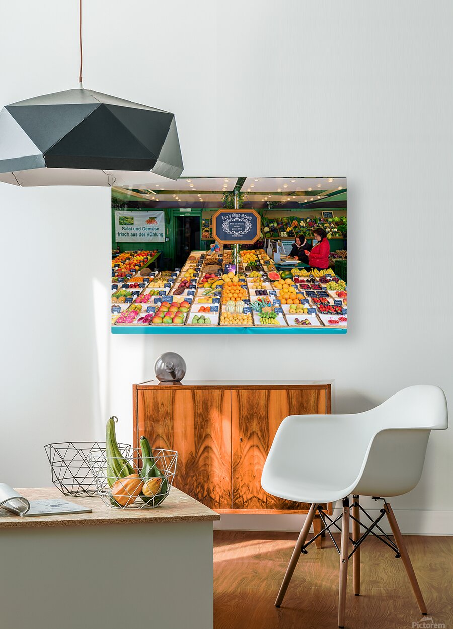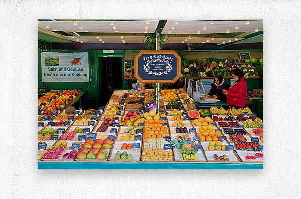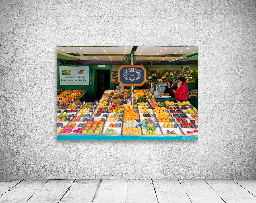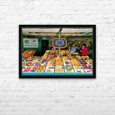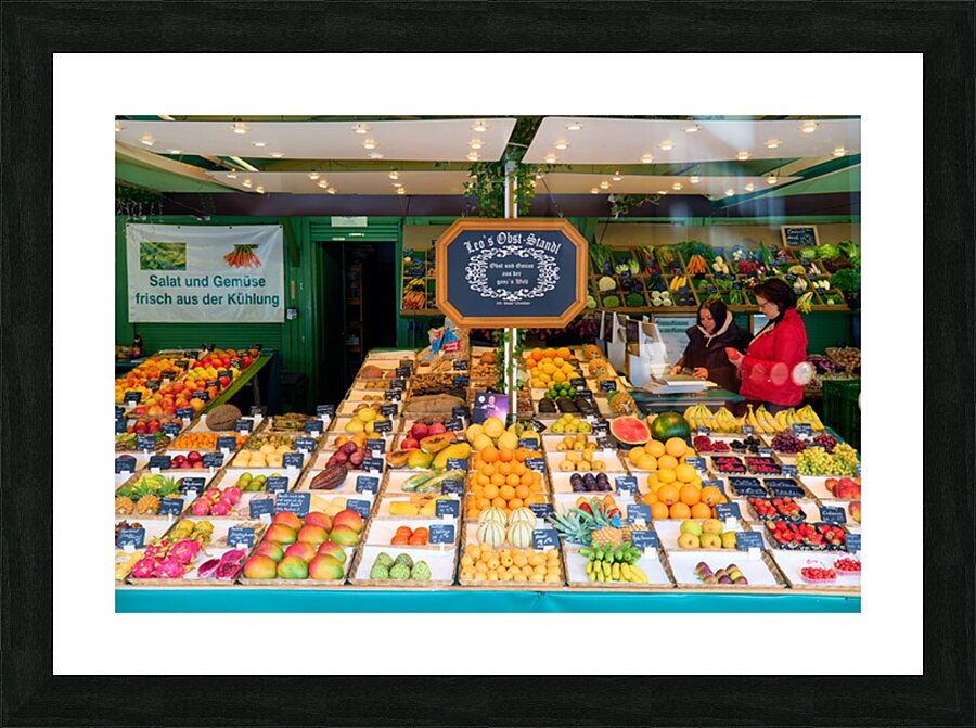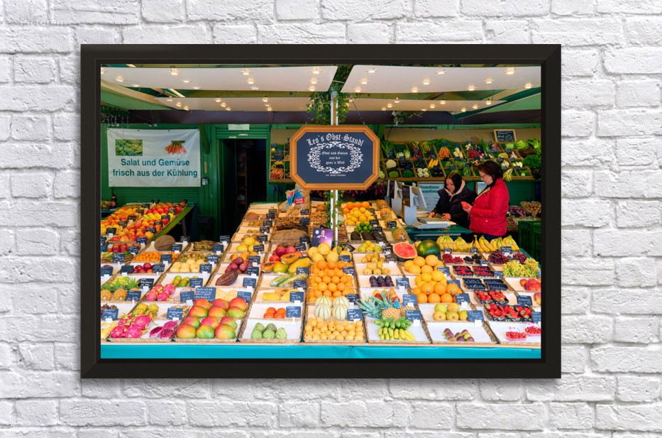 "Fresh produce stands at Viktualienmarkt in Munich Germany" in a framed print.