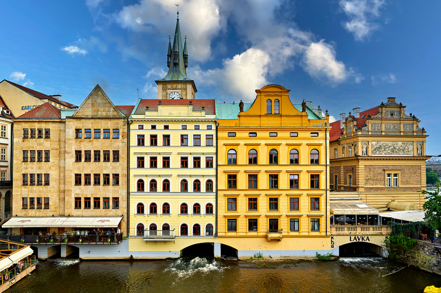Historic buildings line the Vltava River in Prague Czech Republic featuring restaurants like Mlynec and the Lavka Club with a clock tower overlooking