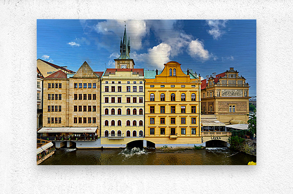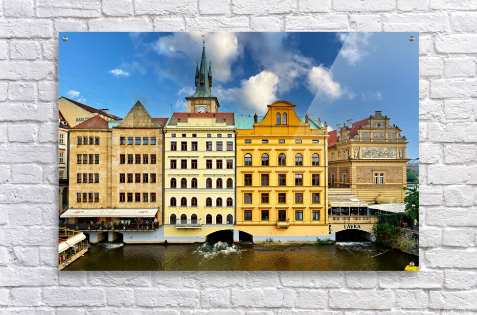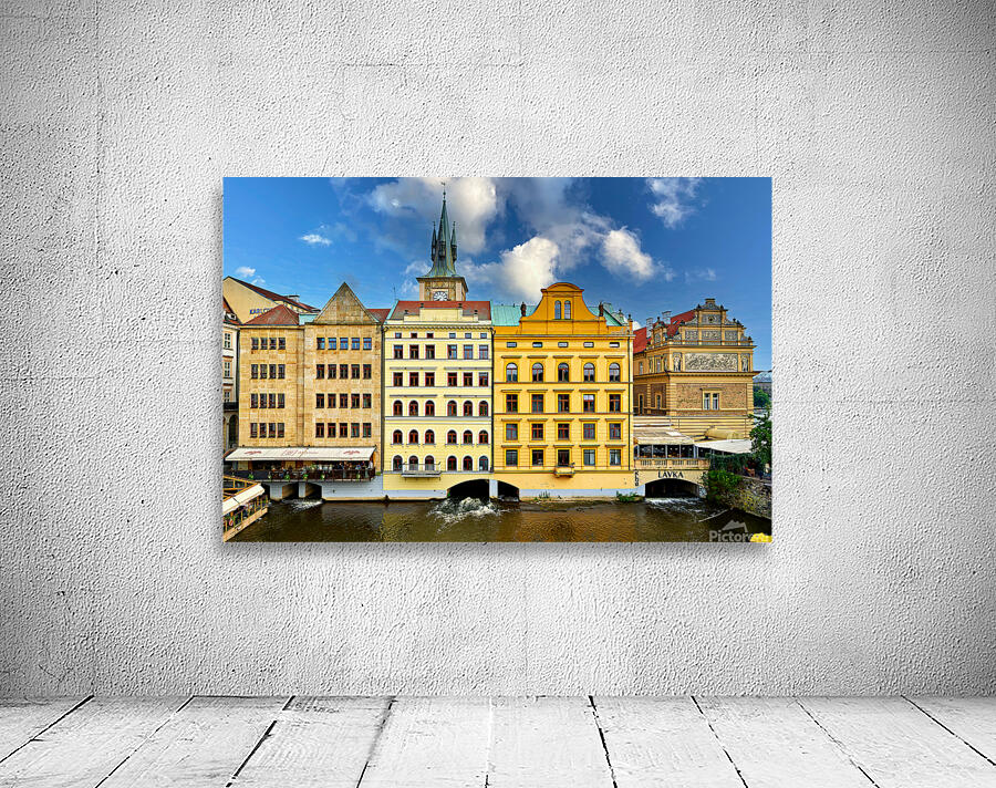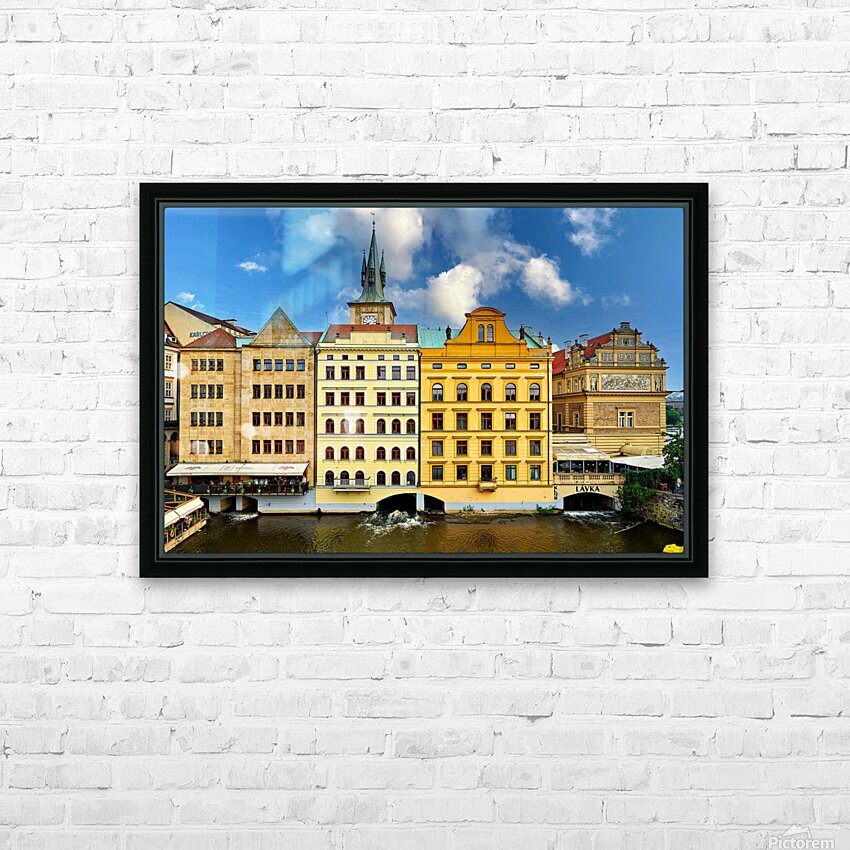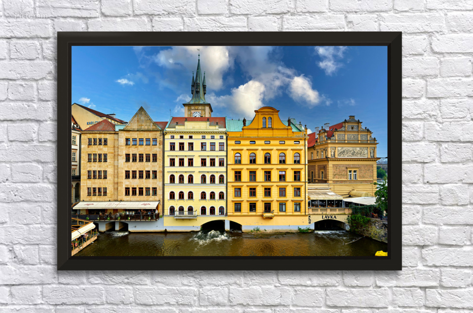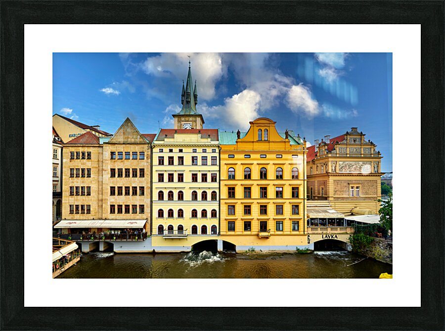 "Historic Prague buildings and clock tower line a scenic river." in a framed print.