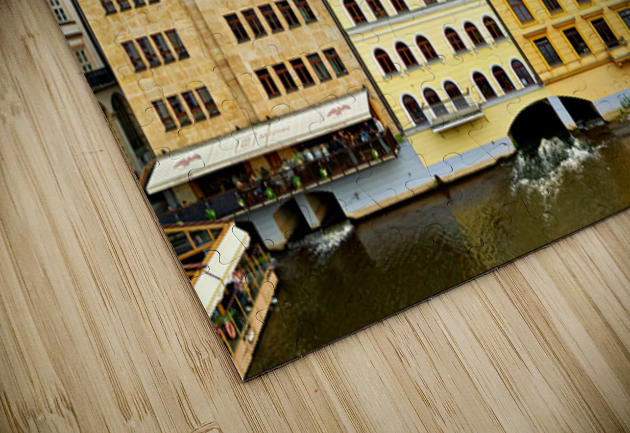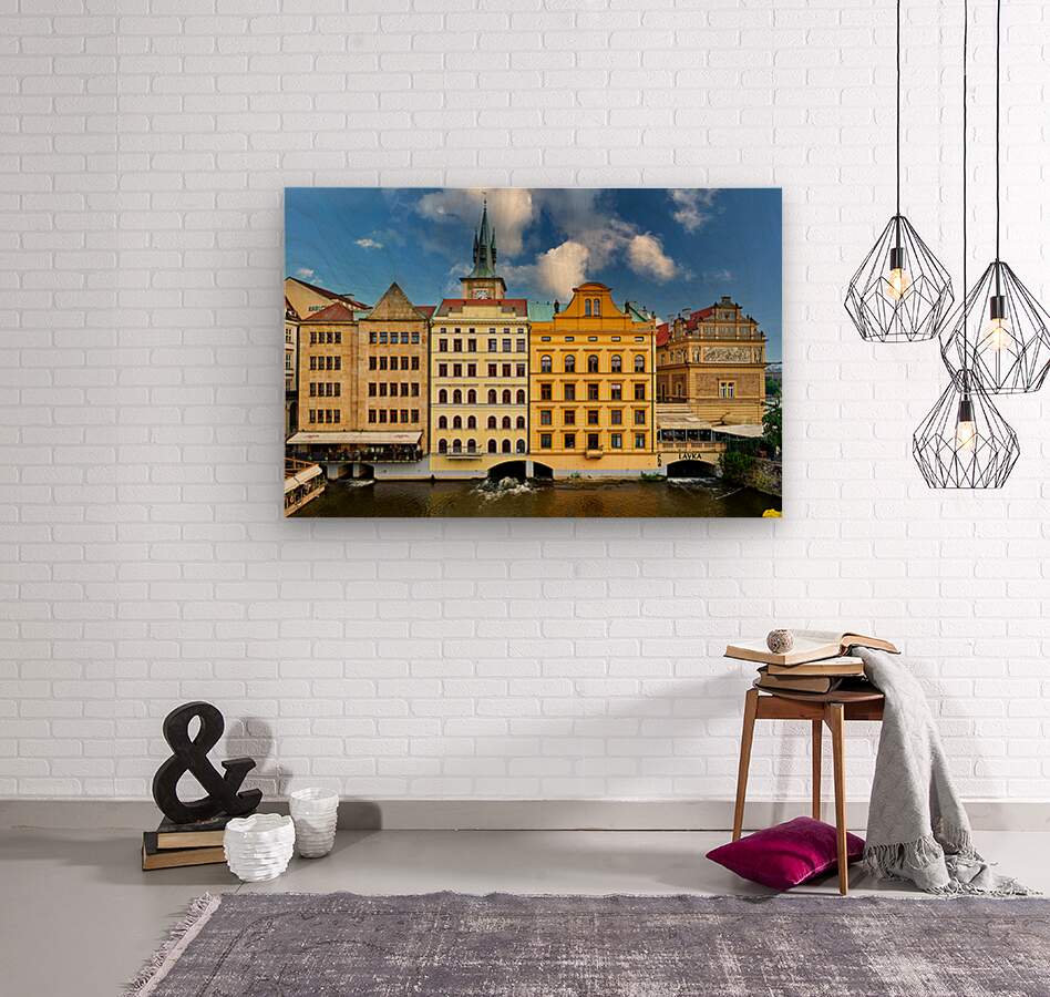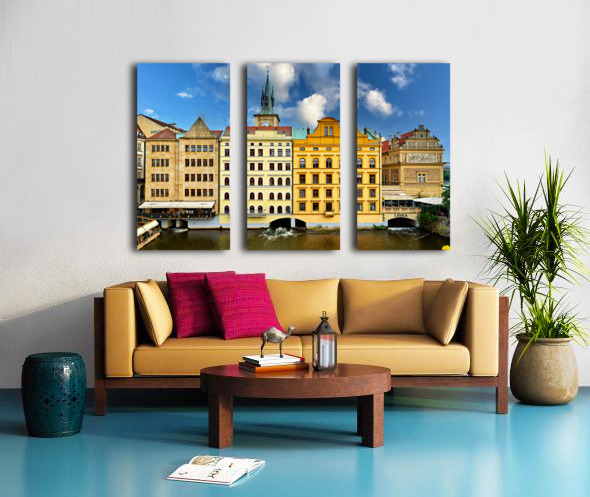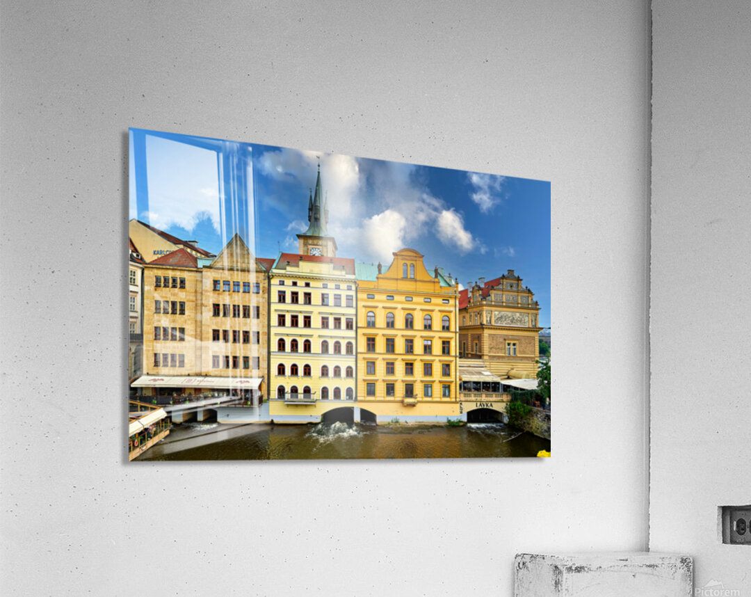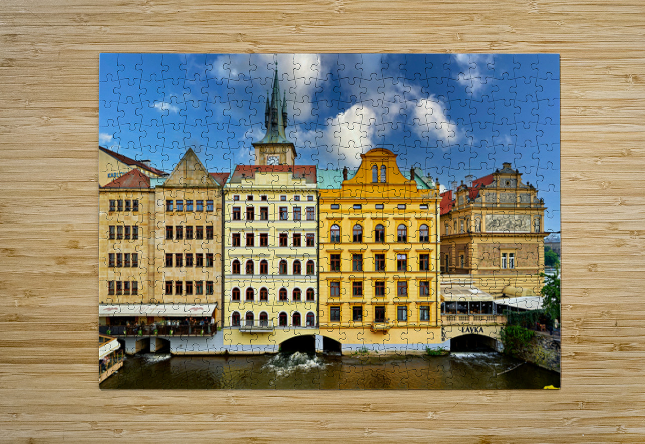 "Historic Prague buildings and clock tower line a scenic river." in a framed print.
