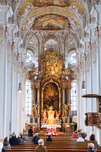 People attend a religious service inside Heilig-Geist-Kirche in Munich. The church features elaborate architecture and historical artwork.