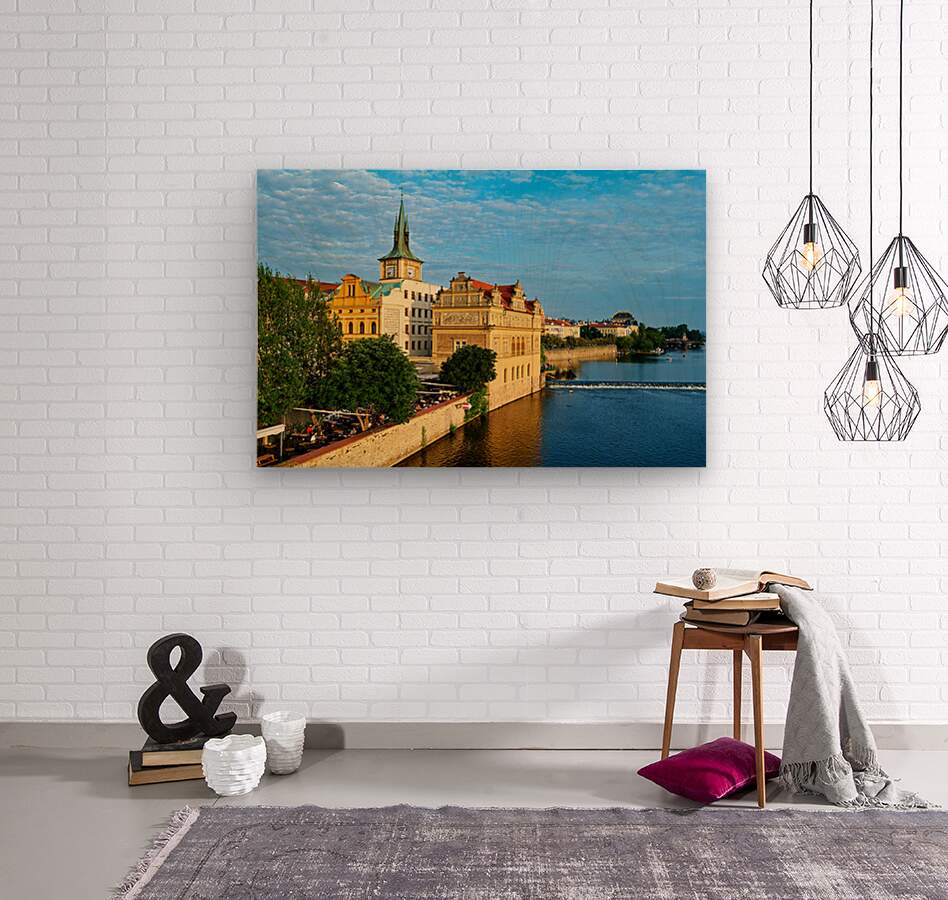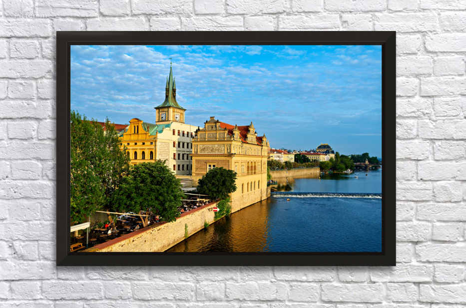 "Pragues Vltava riverfront with historic architecture and lively" in a framed print.