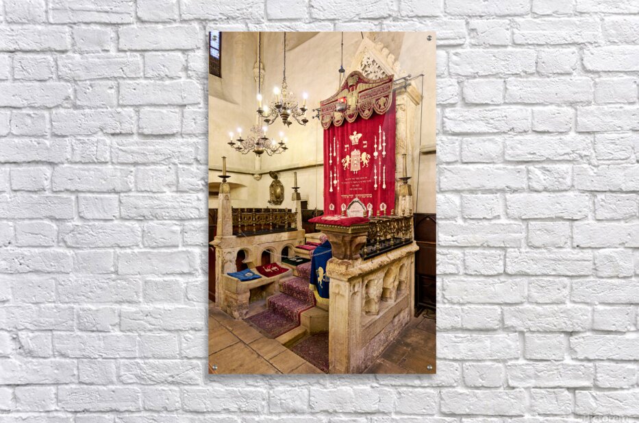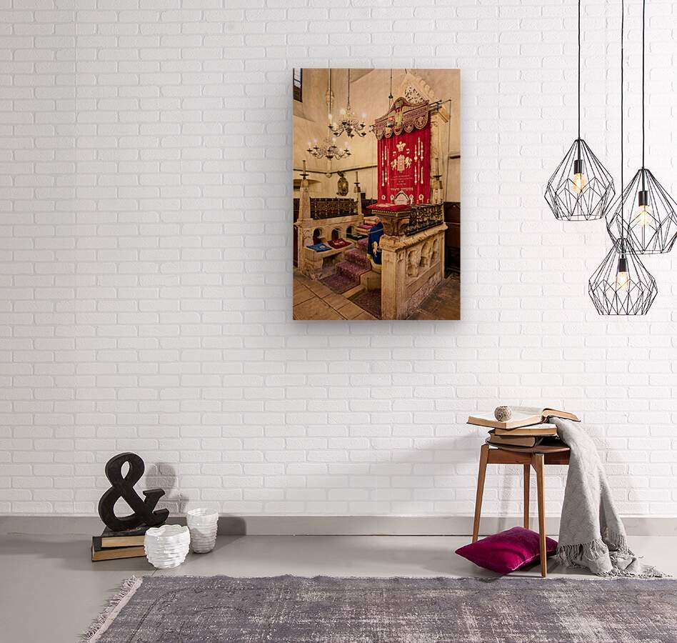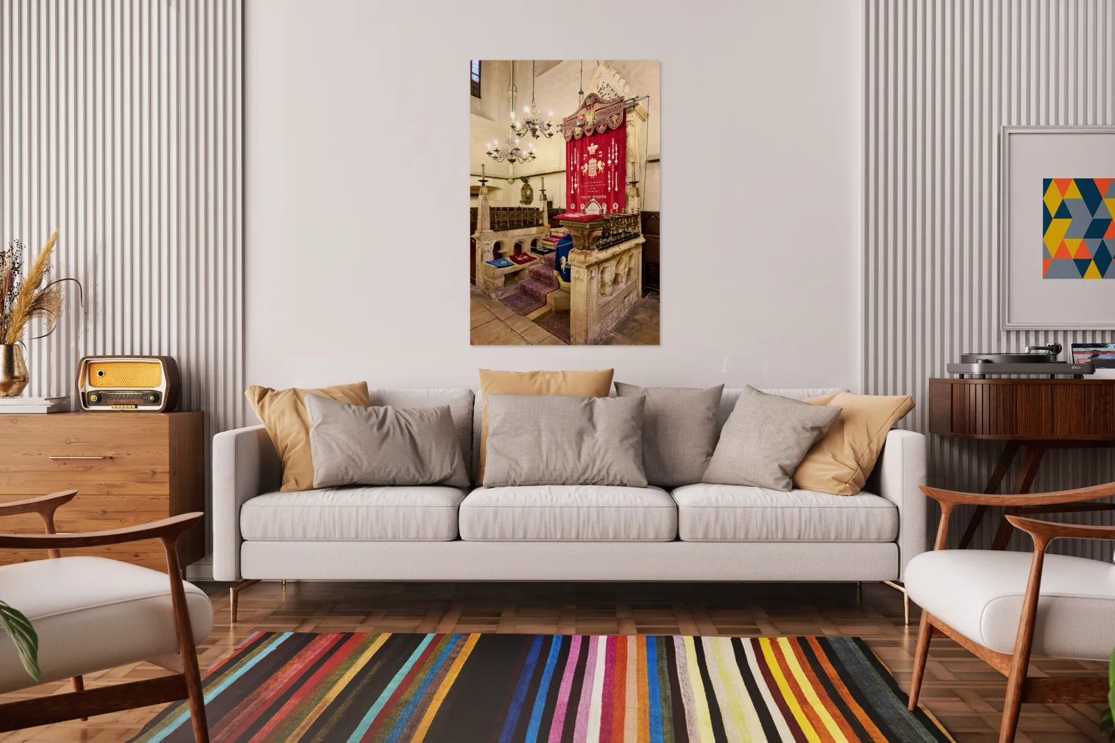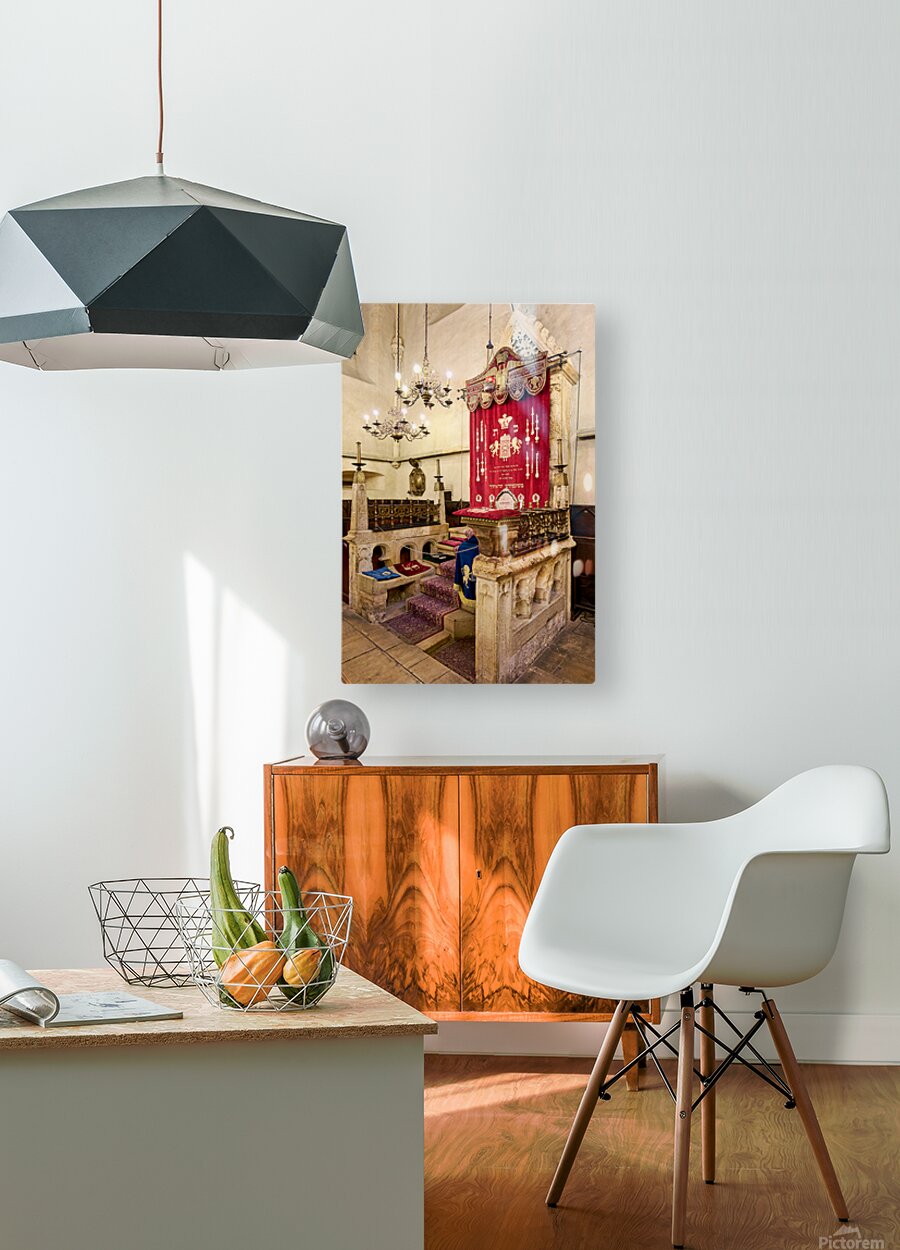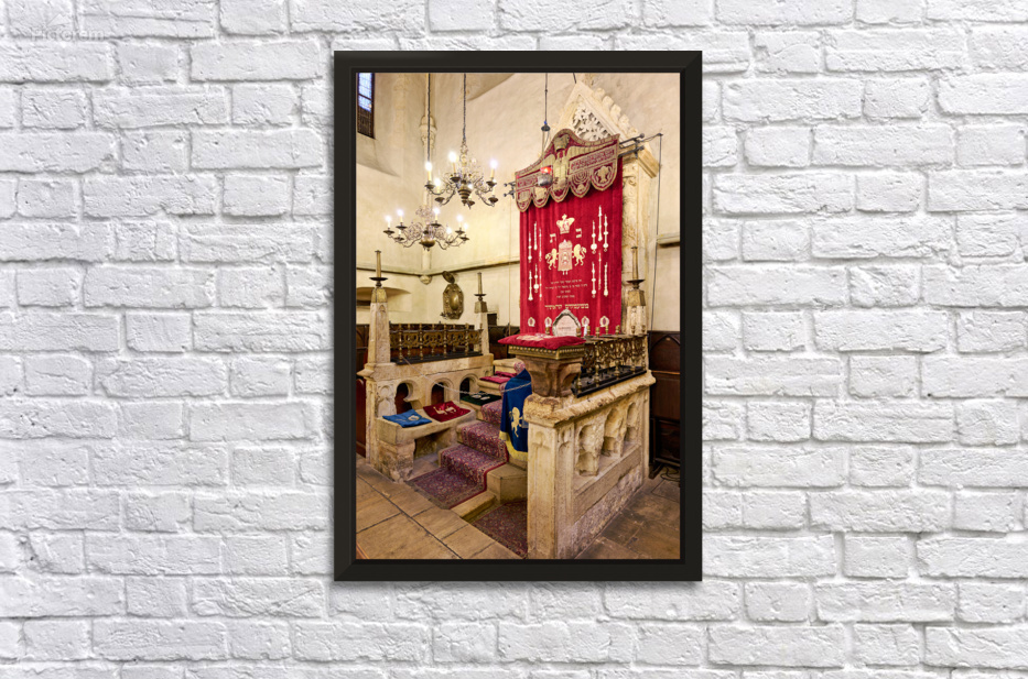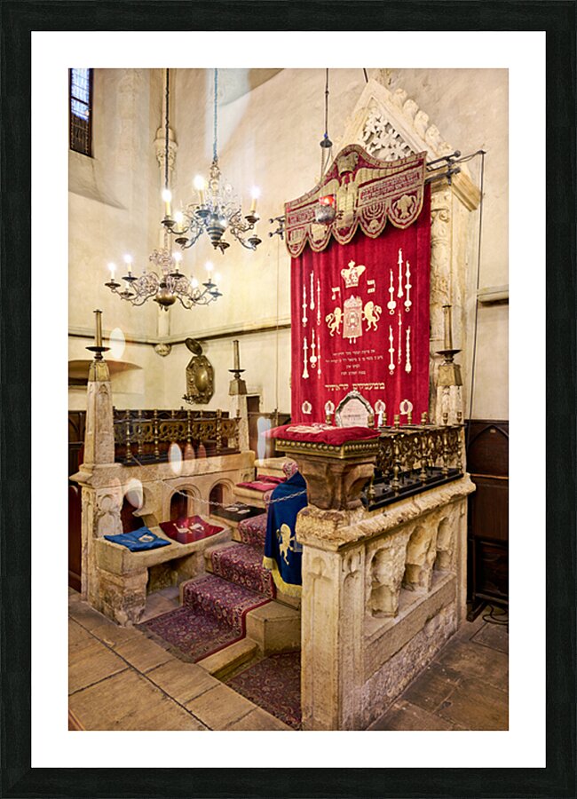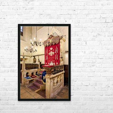 "Historic synagogue interior with ornate Ark and bimah." in a framed print.
