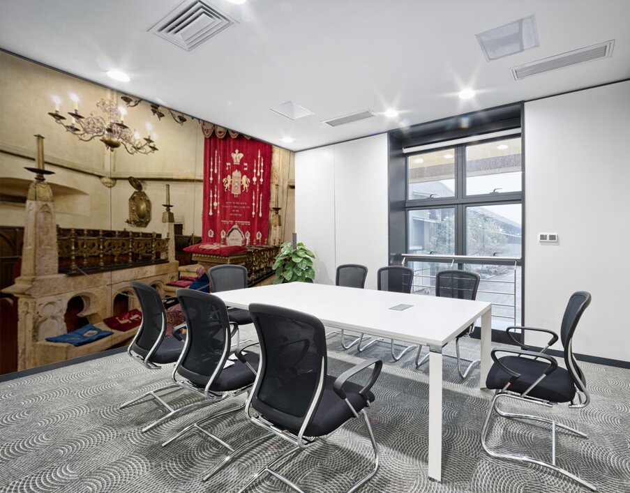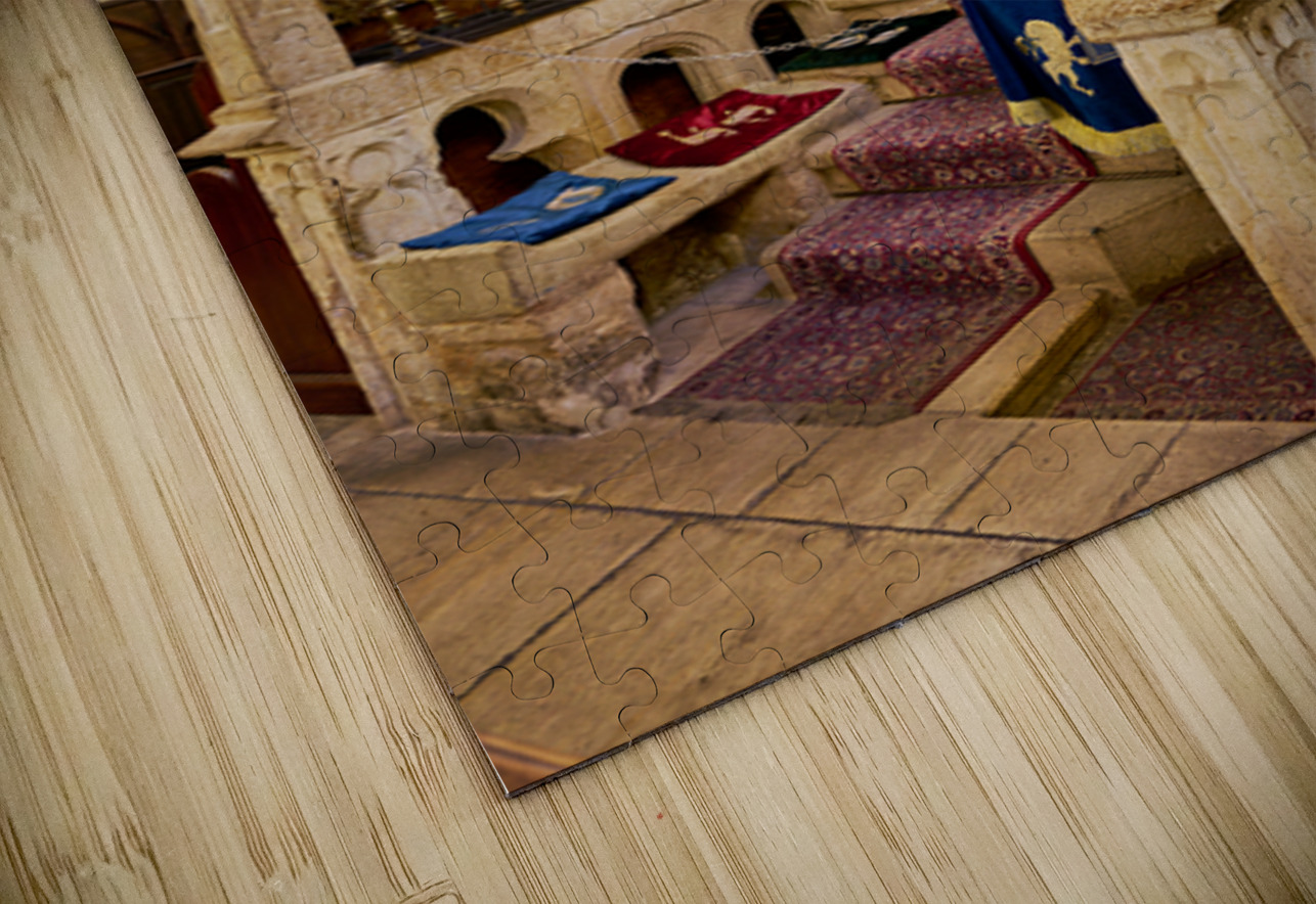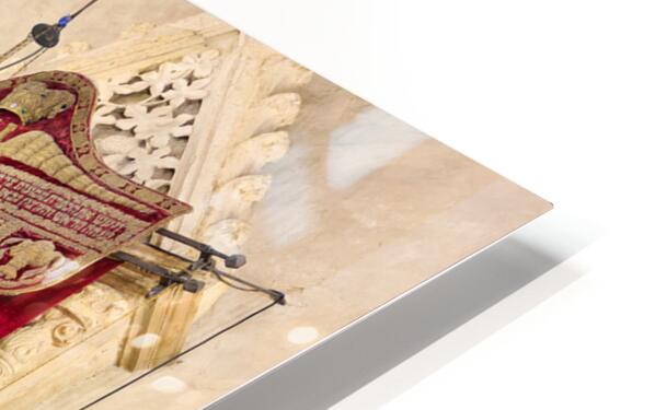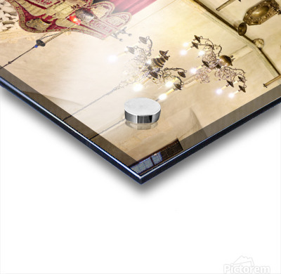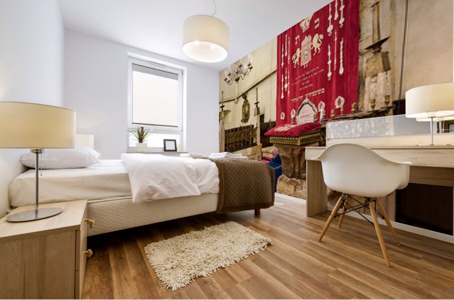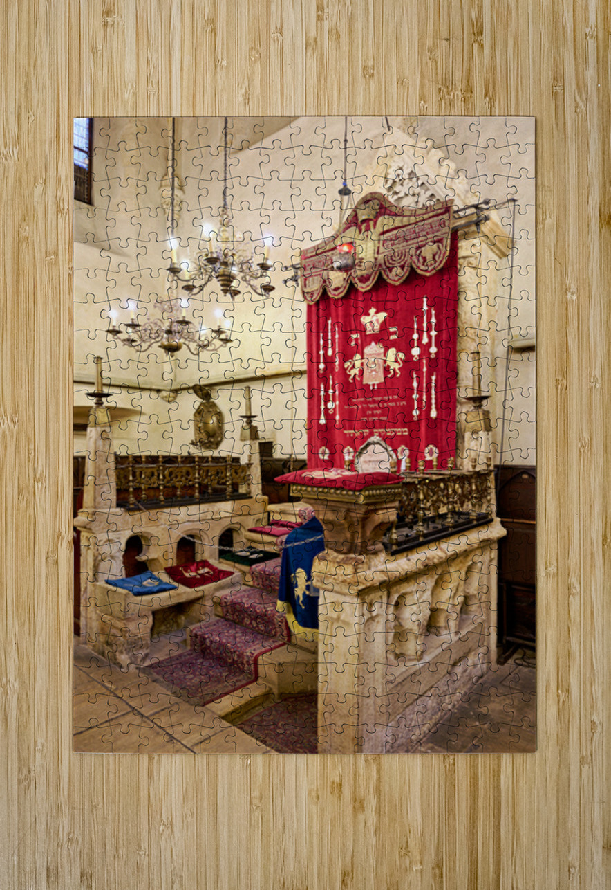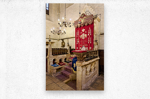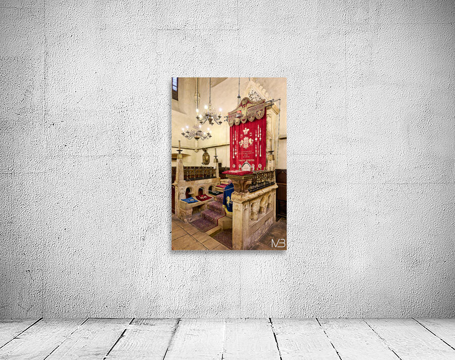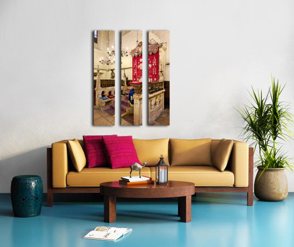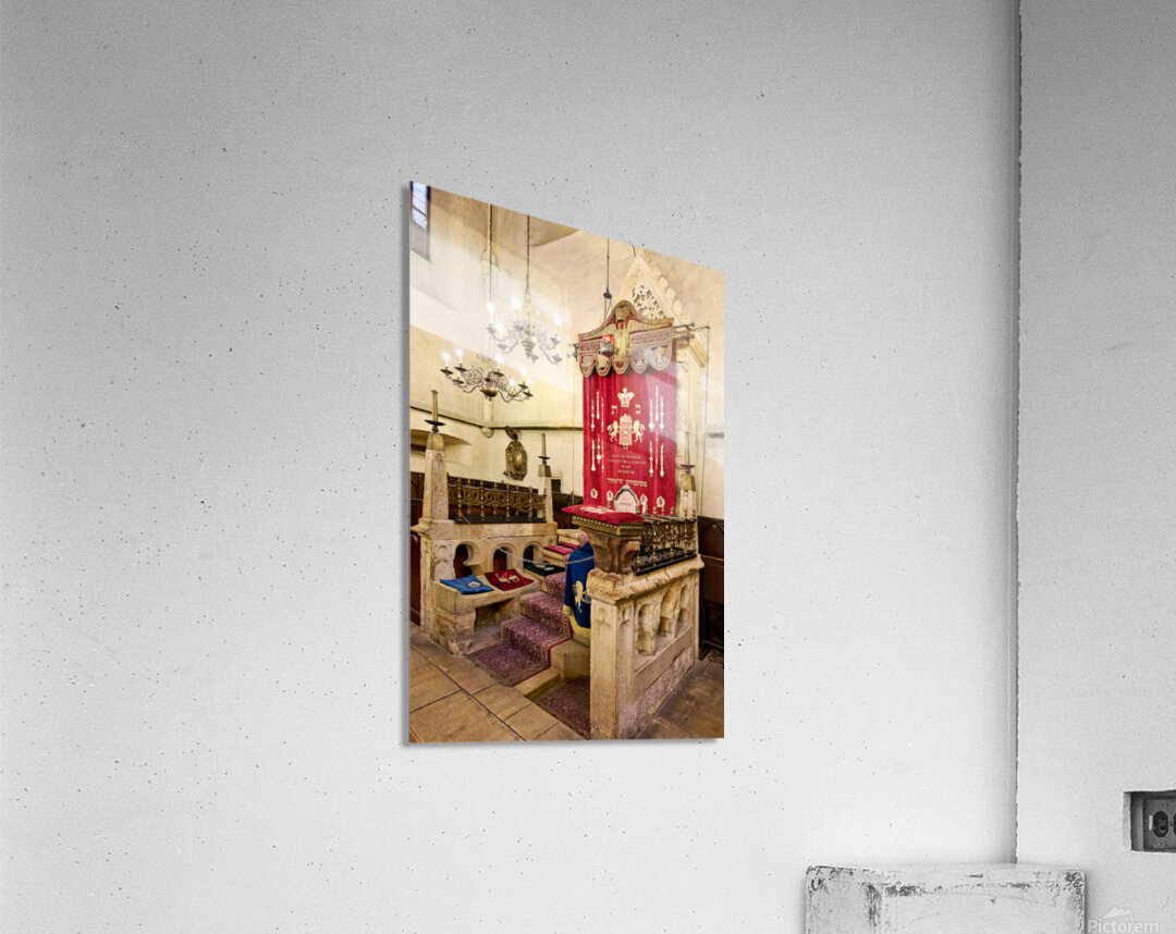 "Historic synagogue interior with ornate Ark and bimah." in a framed print.