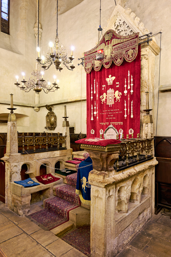 Interior of the historic Old-New Synagogue in Prague Czech Republic showcasing the ornate Ark and bimah a sacred space for Jewish worship.