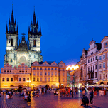 Tourists and locals gather in Pragues Old Town Square at dusk enjoying the illuminated Church of Our Lady before Týn and vibrant atmosphere.