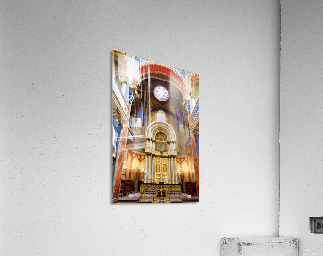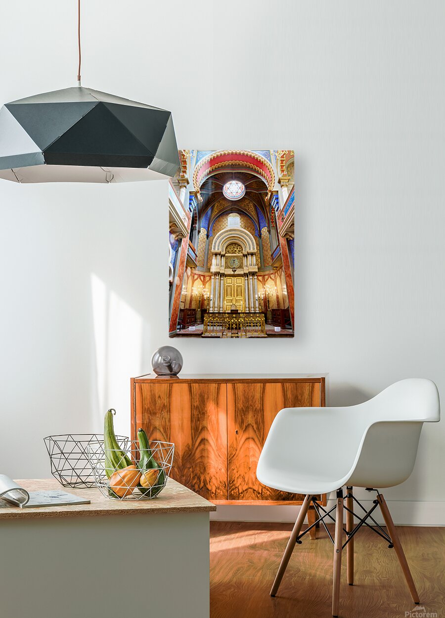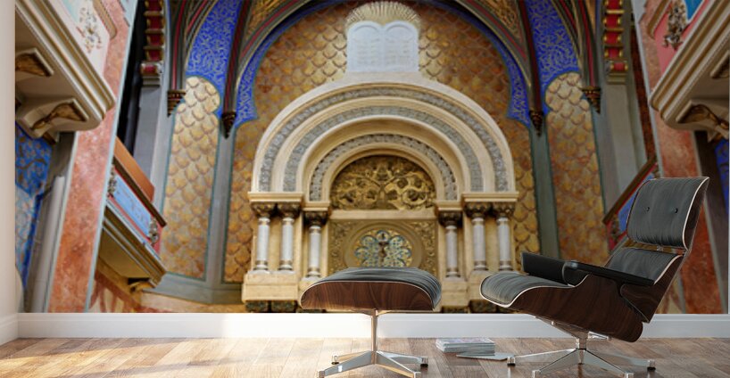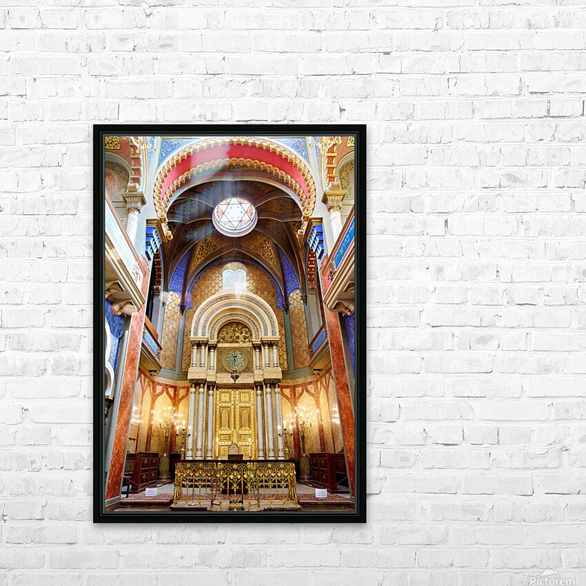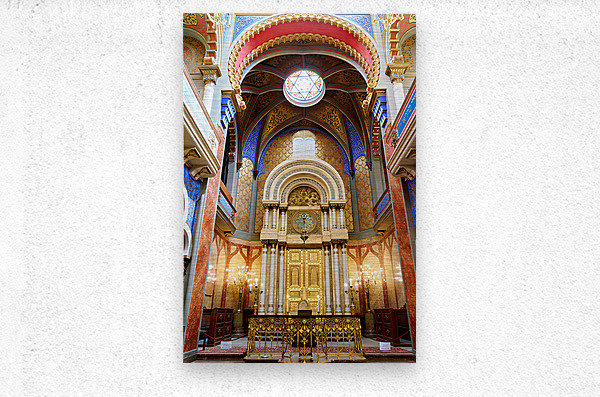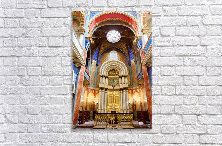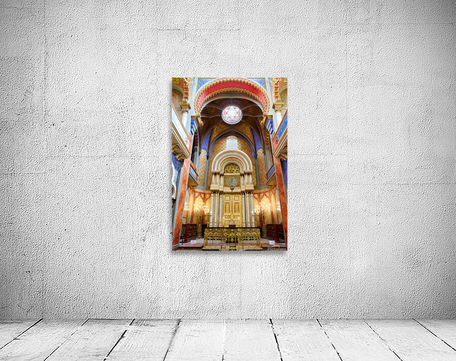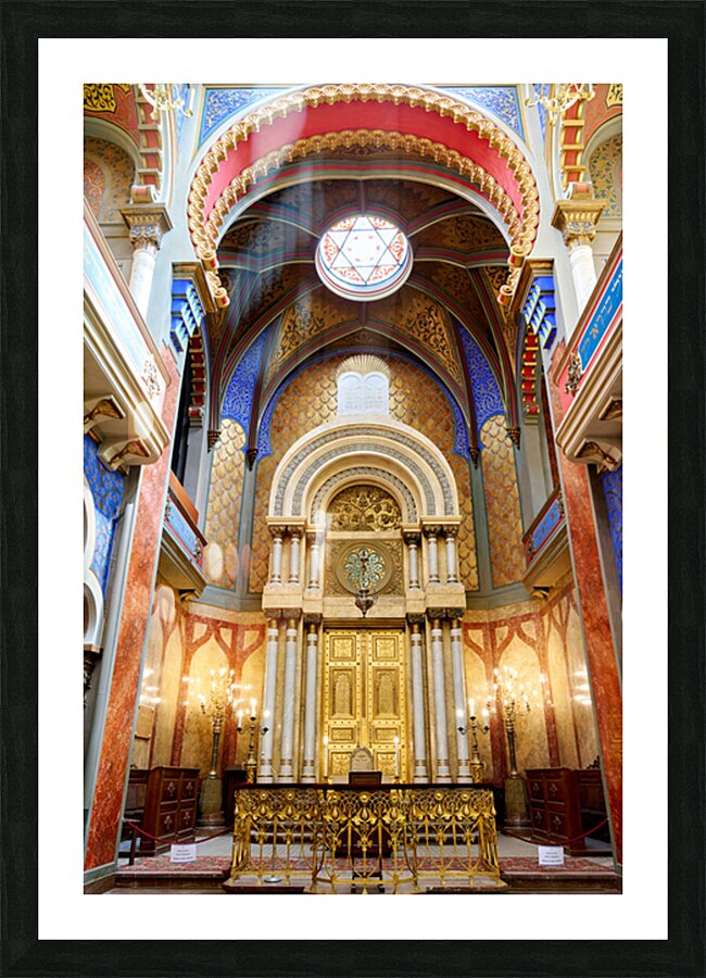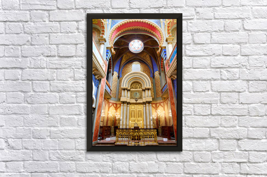 "Ornate synagogue interior with golden ark and colorful decoratio" in a framed print.